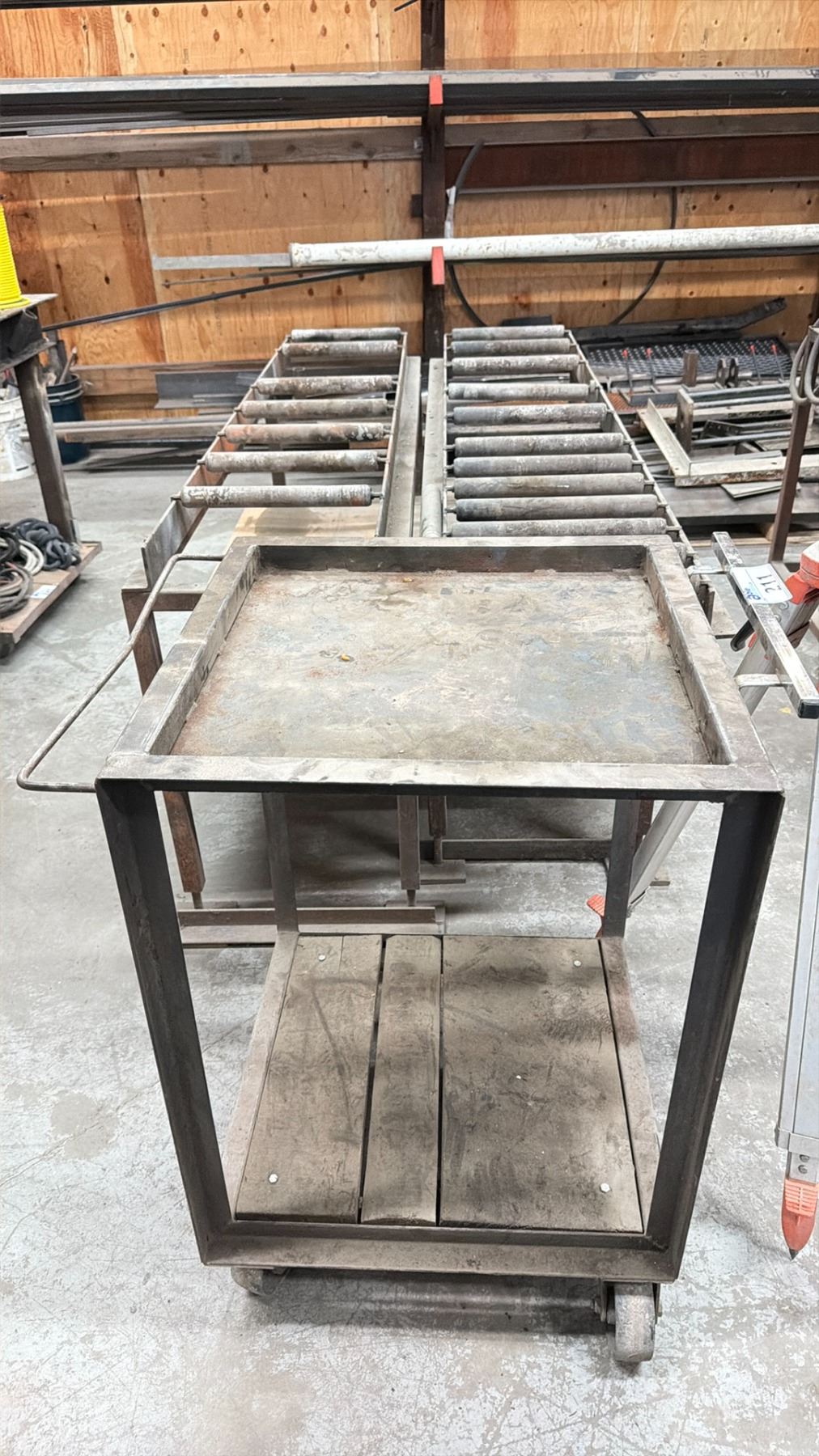 MOBILE STEEL WORK CART (30"X 24"X 37" HIGH) AND 2 STEEL MATERIAL ROLLER CONVEYERS - APPROX. 6 1/2FT X 1 1/2FT X 3FT HIGH