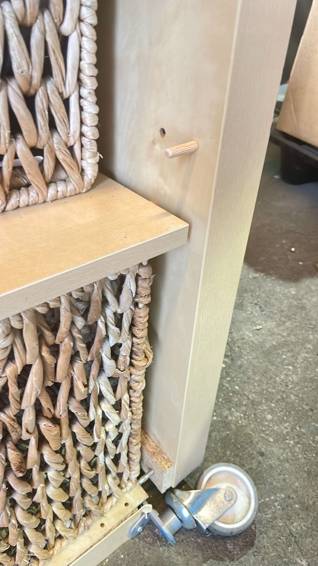 MOBILE STORAGE UNIT WITH 8 WOVEN STORAGE BIN & CONTENTS 59"W X 15.5"D X 36"T *WHEELS NEED TO BE REATTACHED/MUST TAKE ALL*