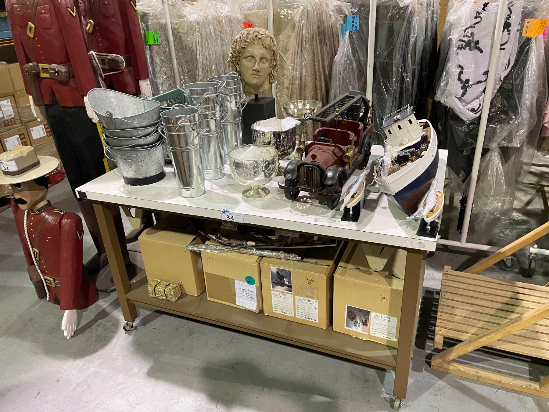 MOBILE TABLE OF ASSORTED BUCKETS, HORSE SHOES, & HOUSEHOLD DECOR ITEMS