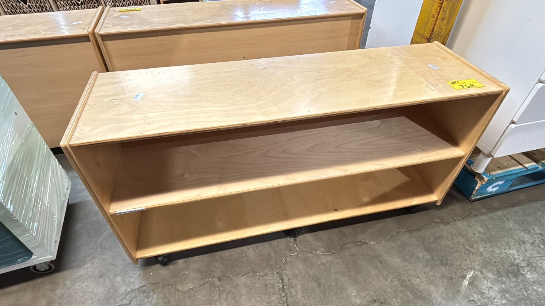 MOBILE WOODEN 2 TIER STORAGE SHELF - APPROX. 48"W X 14"D X 23"H