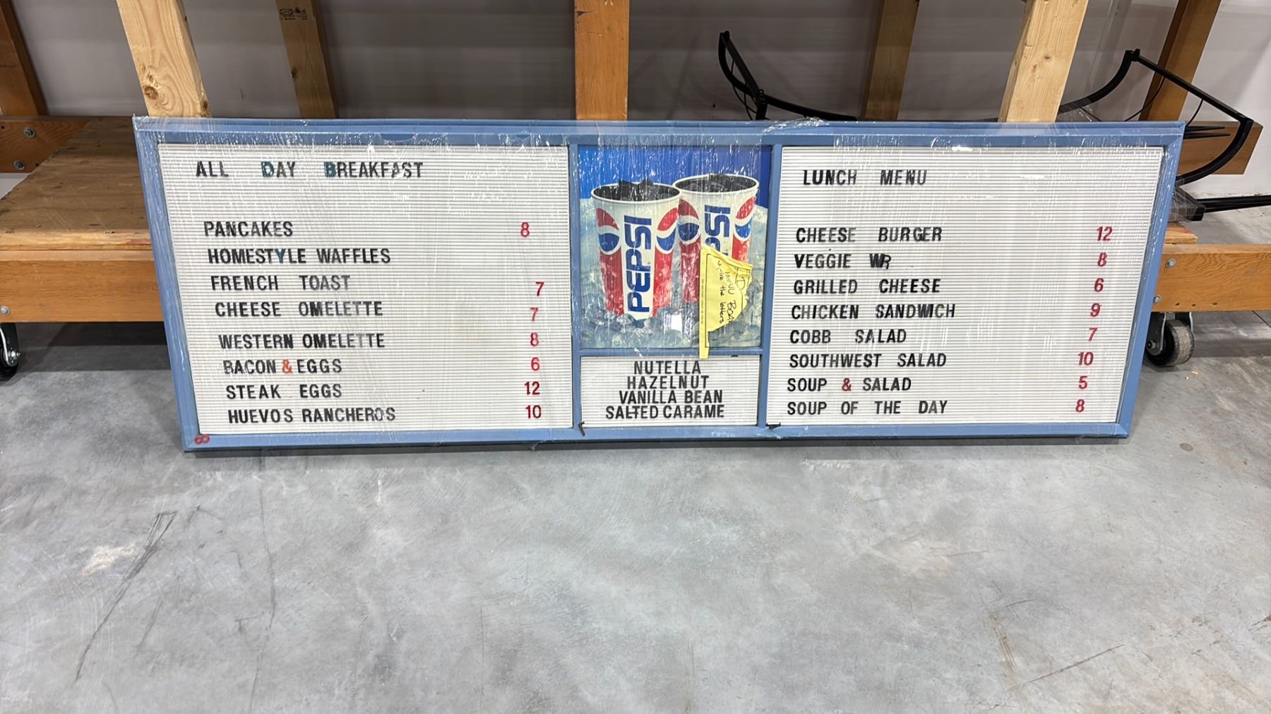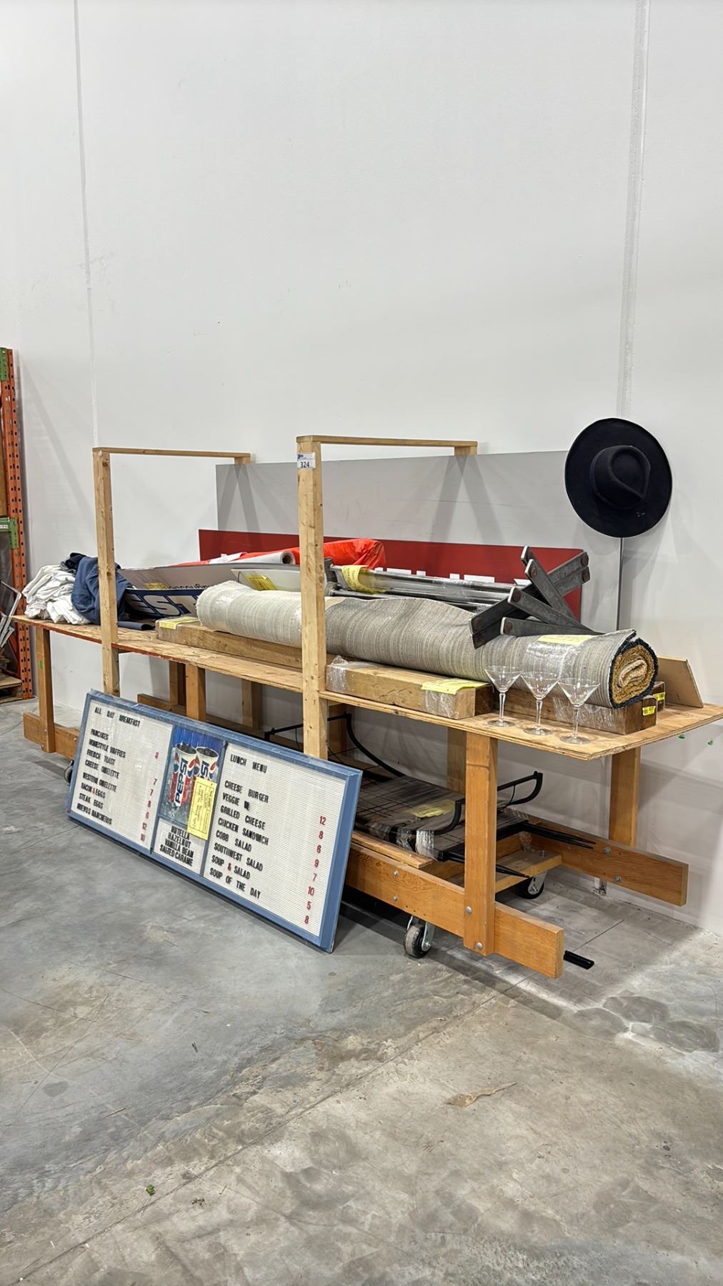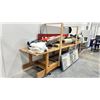 MOBILE WOODEN 2 TIER WORKBENCH, PEPSI MENU BOARD & MORE - WORK BENCH MEASURES APPROX. 146"W X 32"D X 66.5"H