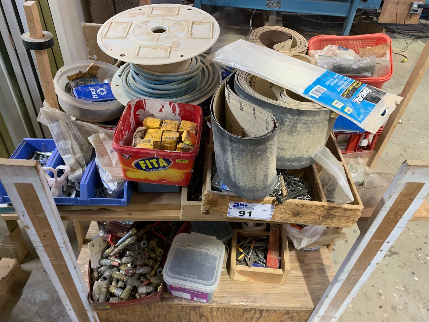 MOBILE WOODEN WORK BENCH (APPROX. 4'W X 2'D X 3.5'H) WITH ASSORTED HARDWARE & SANDING BELTS