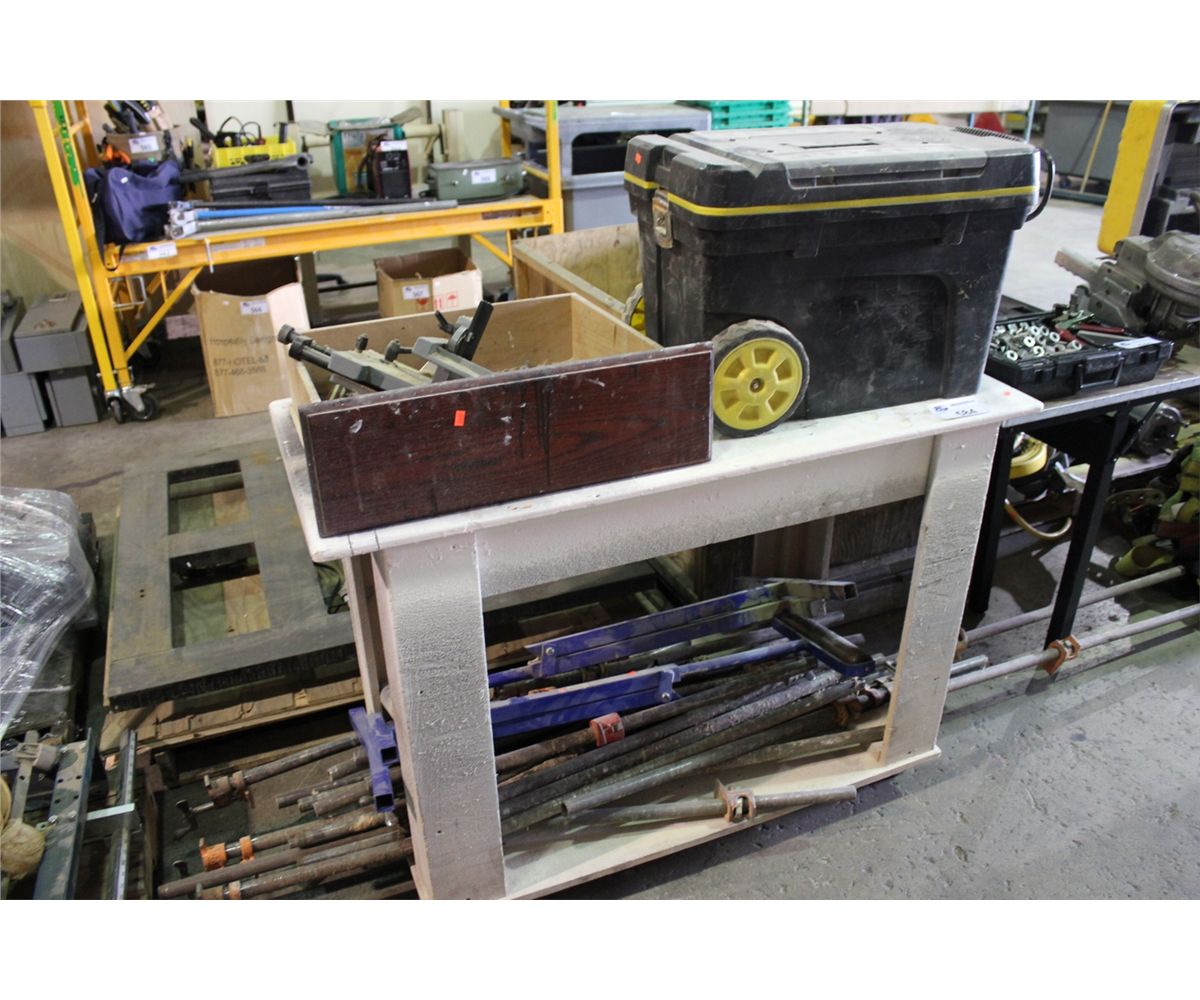 MOBILE WOODEN WORK TABLE WITH PIPE CLAMPS AND HAND TOOLS