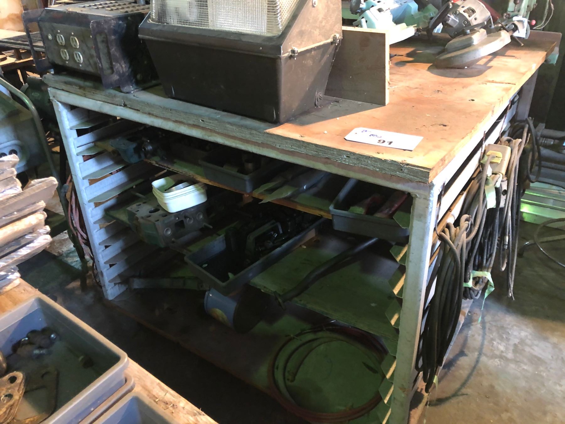 MOBILE WORK BENCH/RACK WITH CONTENTS INCLUDING POWER INVERTER, EXTENSION CABLES, MARINE ENGINE PARTS AND MORE