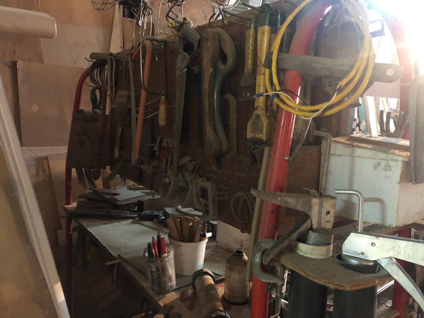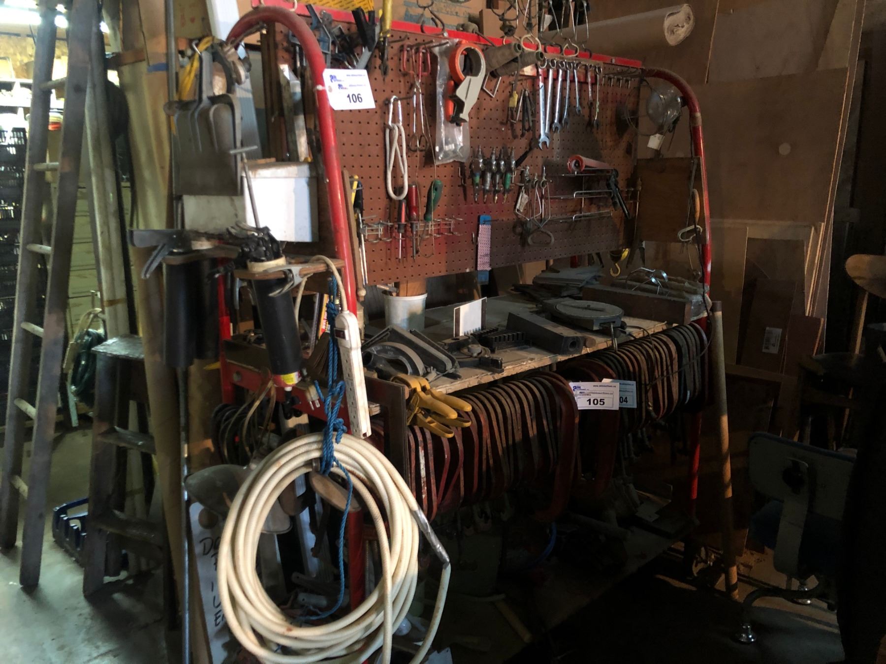 MOBILE WORK BENCH WITH CONTENTS INCLUDING AIR TOOLS, HAND TOOLS, LAMPS, SAWS AND MORE