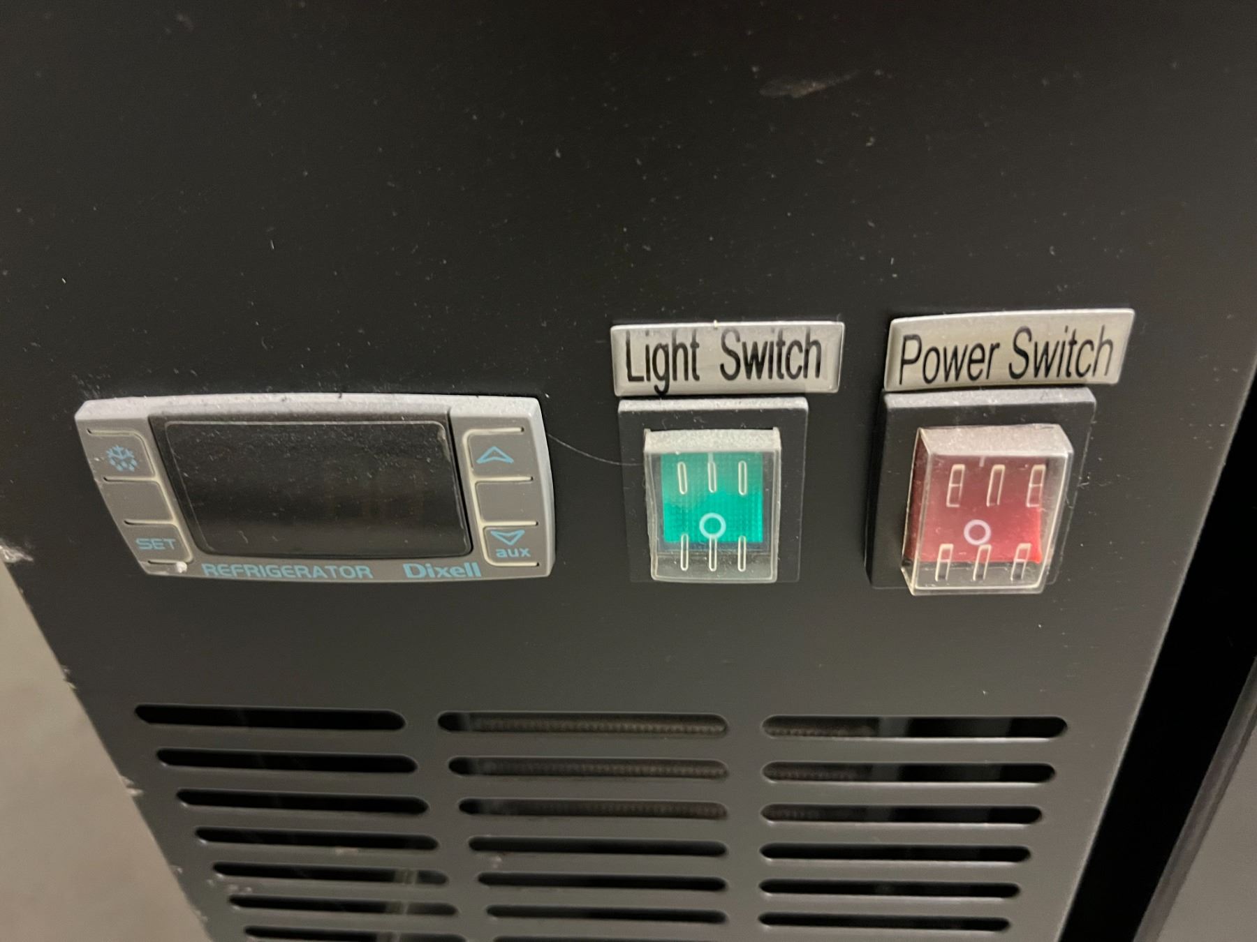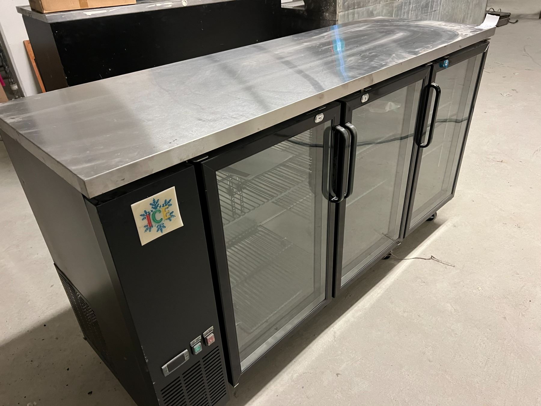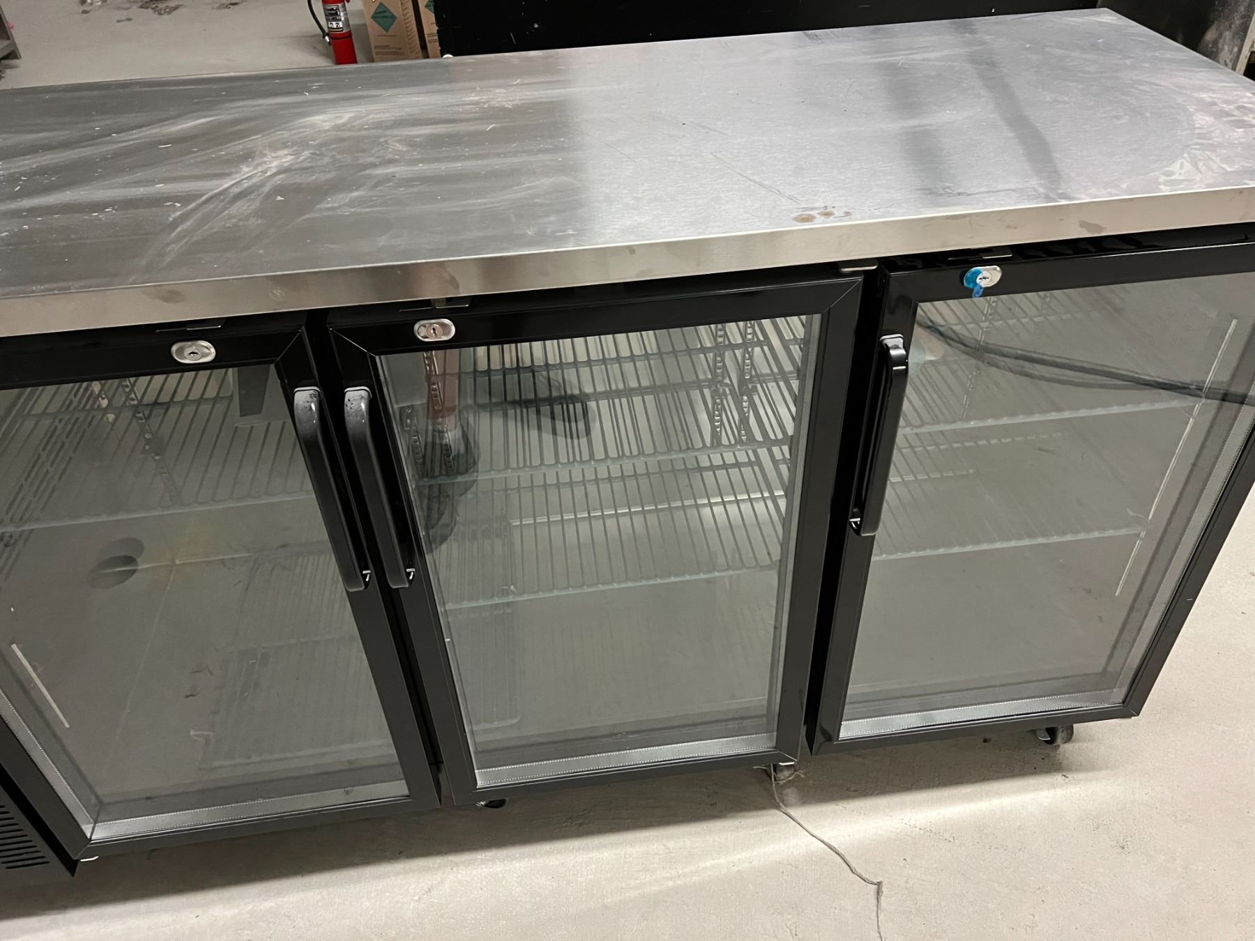 MODEL BBAR-24-3D/GB-72. NEW 3 DOOR CHILLER UNIT WITH KEYS. GLASS DOORS, STAINLESS TOP, MANUAL