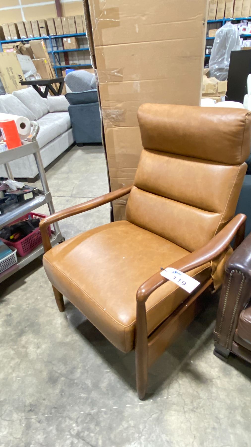 MODELED BROWN LEATHER DESIGNER WOOD FRAMED POWERED HIGH BACK RECLINING ARMCHAIR