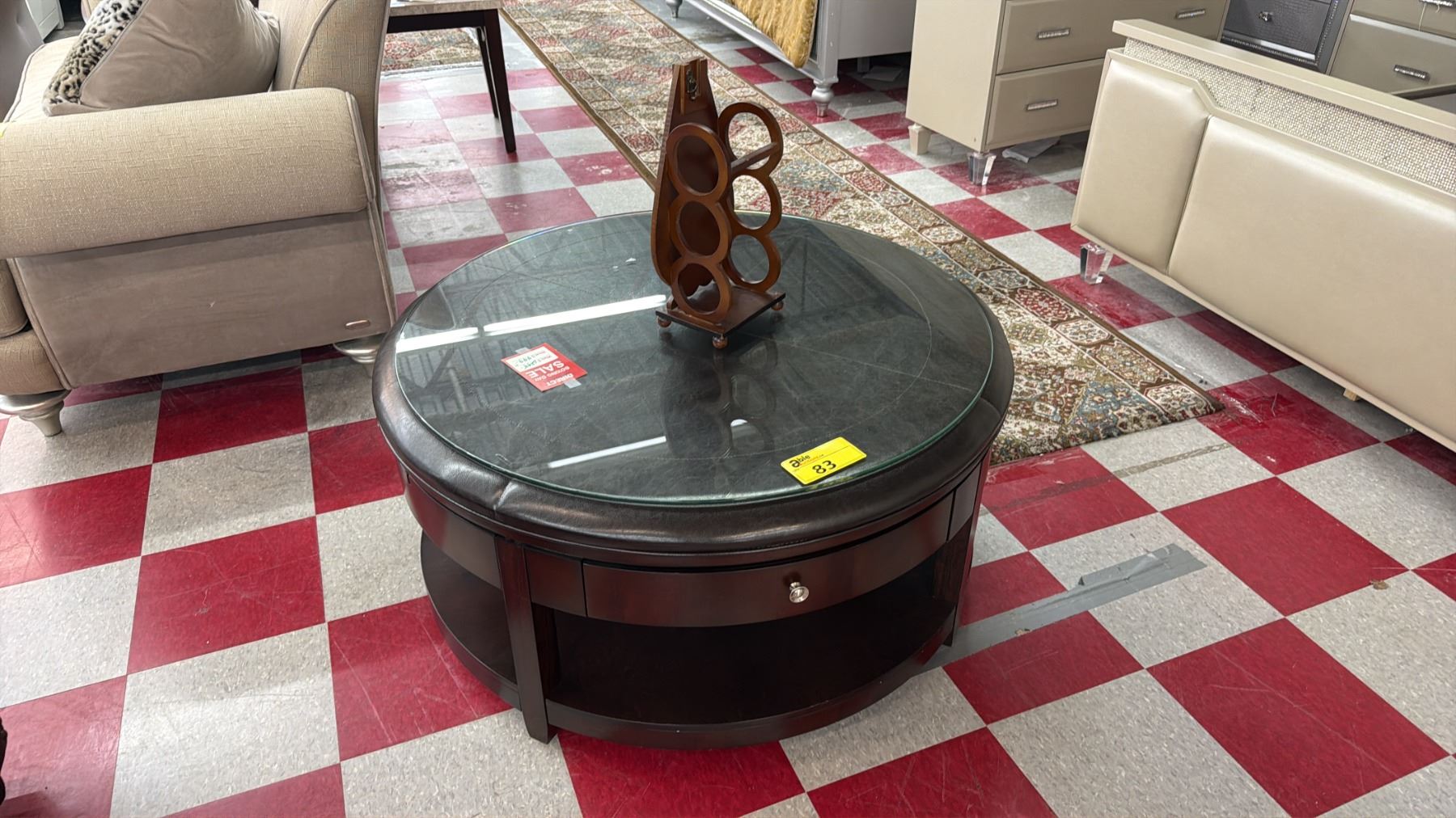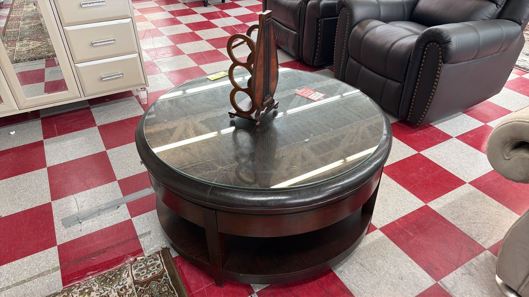 MODERN ROUND WOOD, LEATHER & GLASS COFFEE TABLE