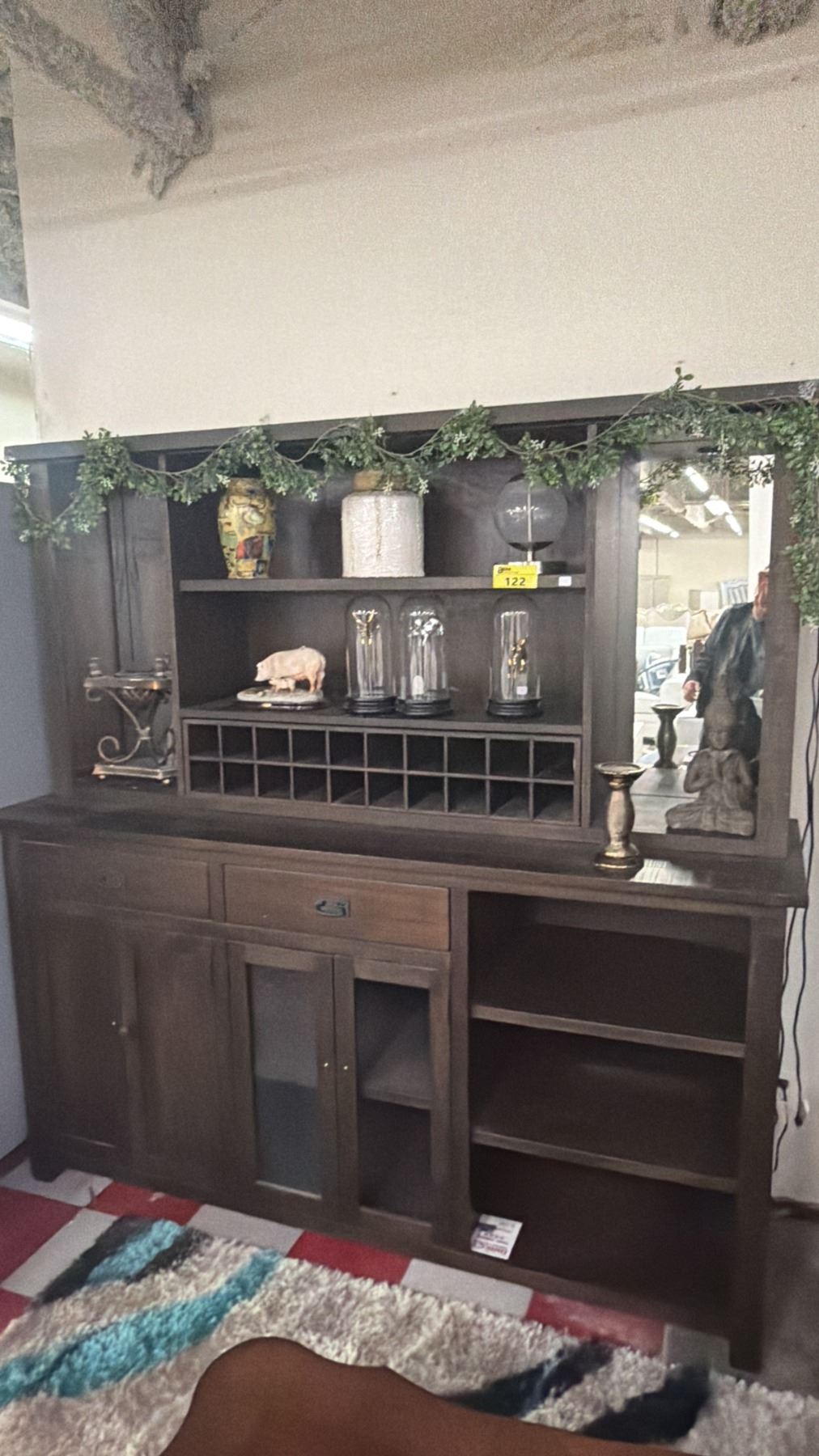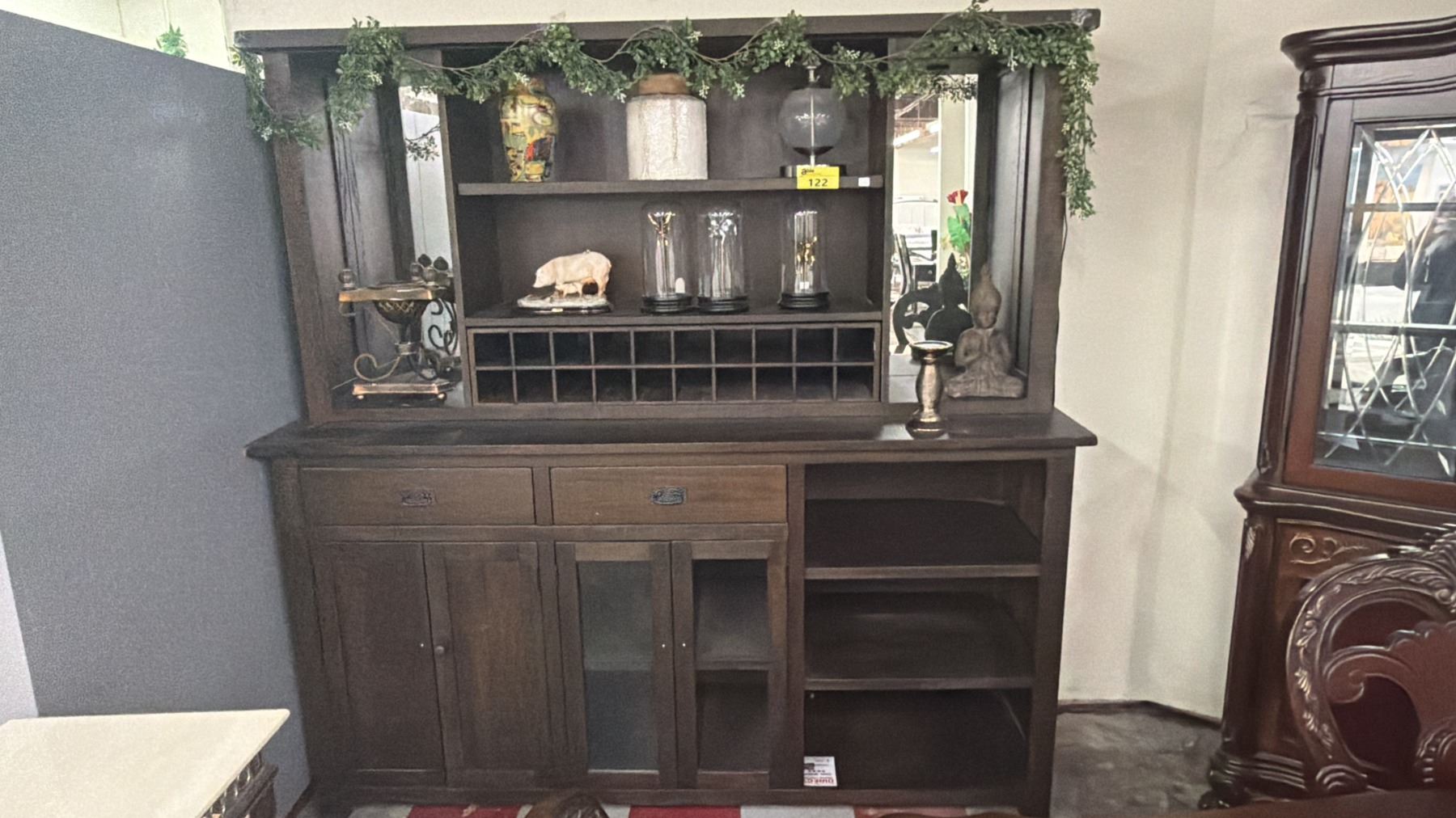 MODERN WOOD BUFFET & HUTCH WITH ASSORTED CONTENTS