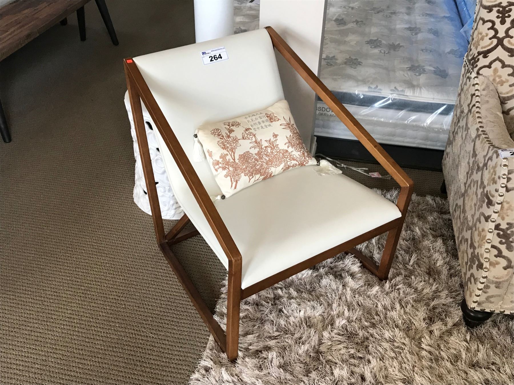 MODERN WOOD & CREAM LEATHER OCCASIONAL CHAIR WITH THROW PILLOW