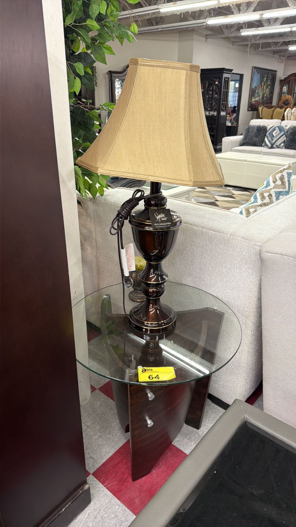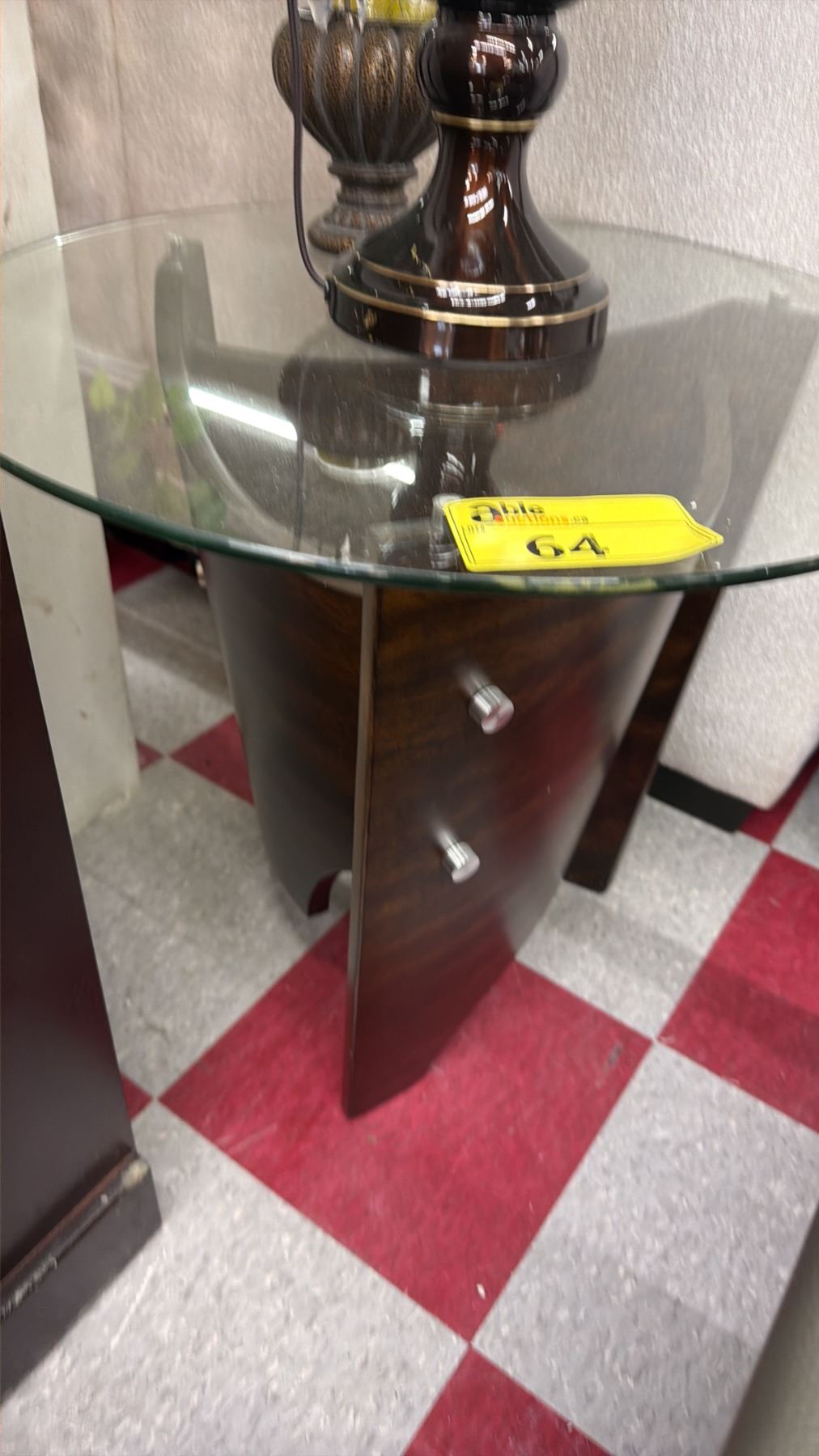 MODERN WOOD & GLASS TOP ROUND END TABLE & TABLE LAMP