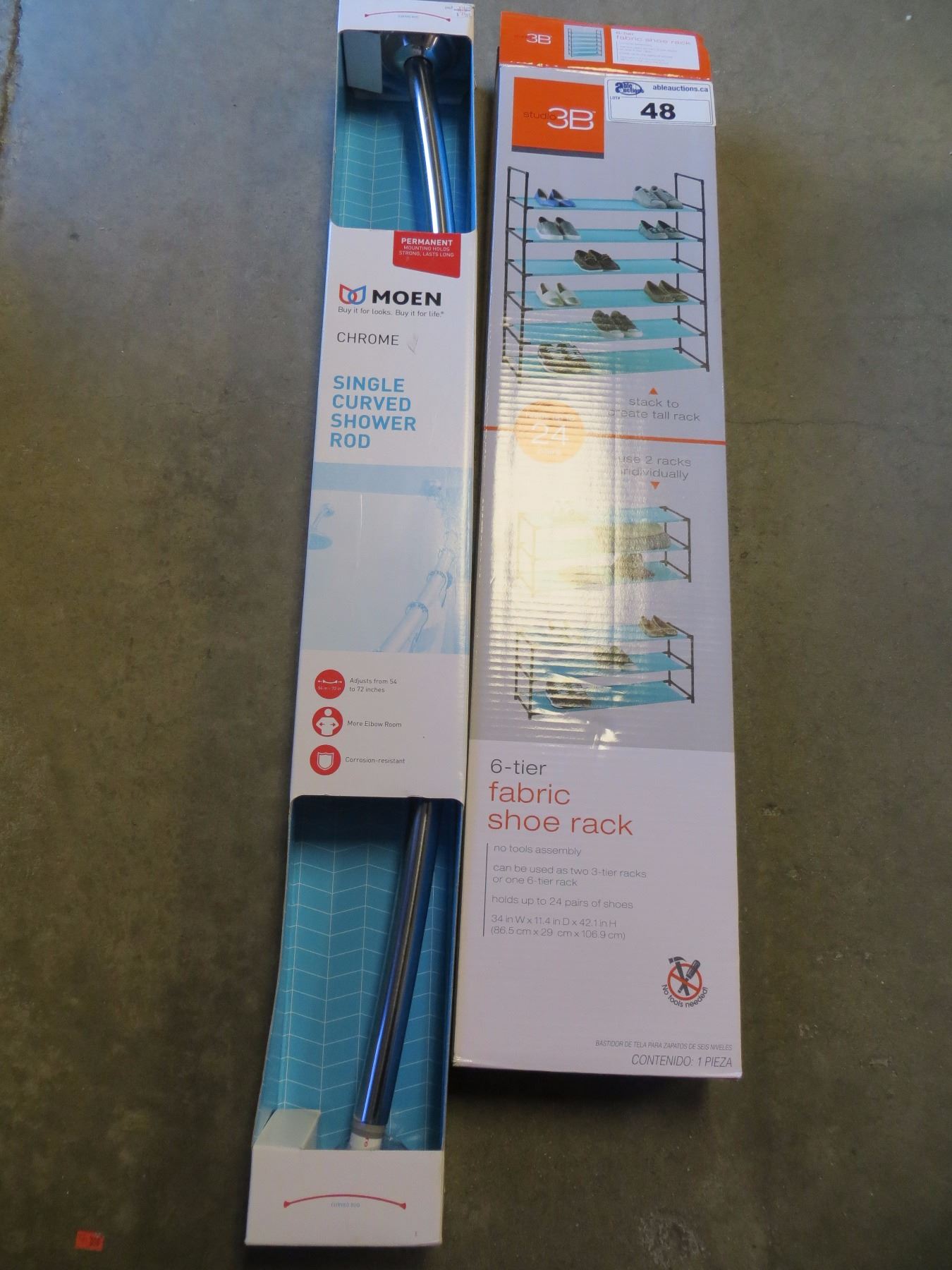 MOEN CHROME SINGLE CURVED SHOWER ROD/STUDIO3B 6-TIER FABRIC SHOE RACK