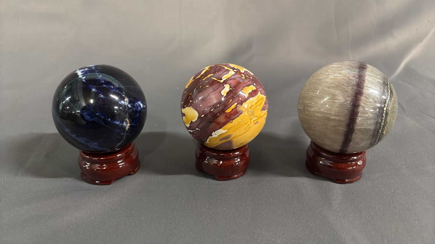 MOOAKITE JASPER, BLUE SODALITE & FLUORITE QUARTZ 2.5" SPHERES ON STANDS