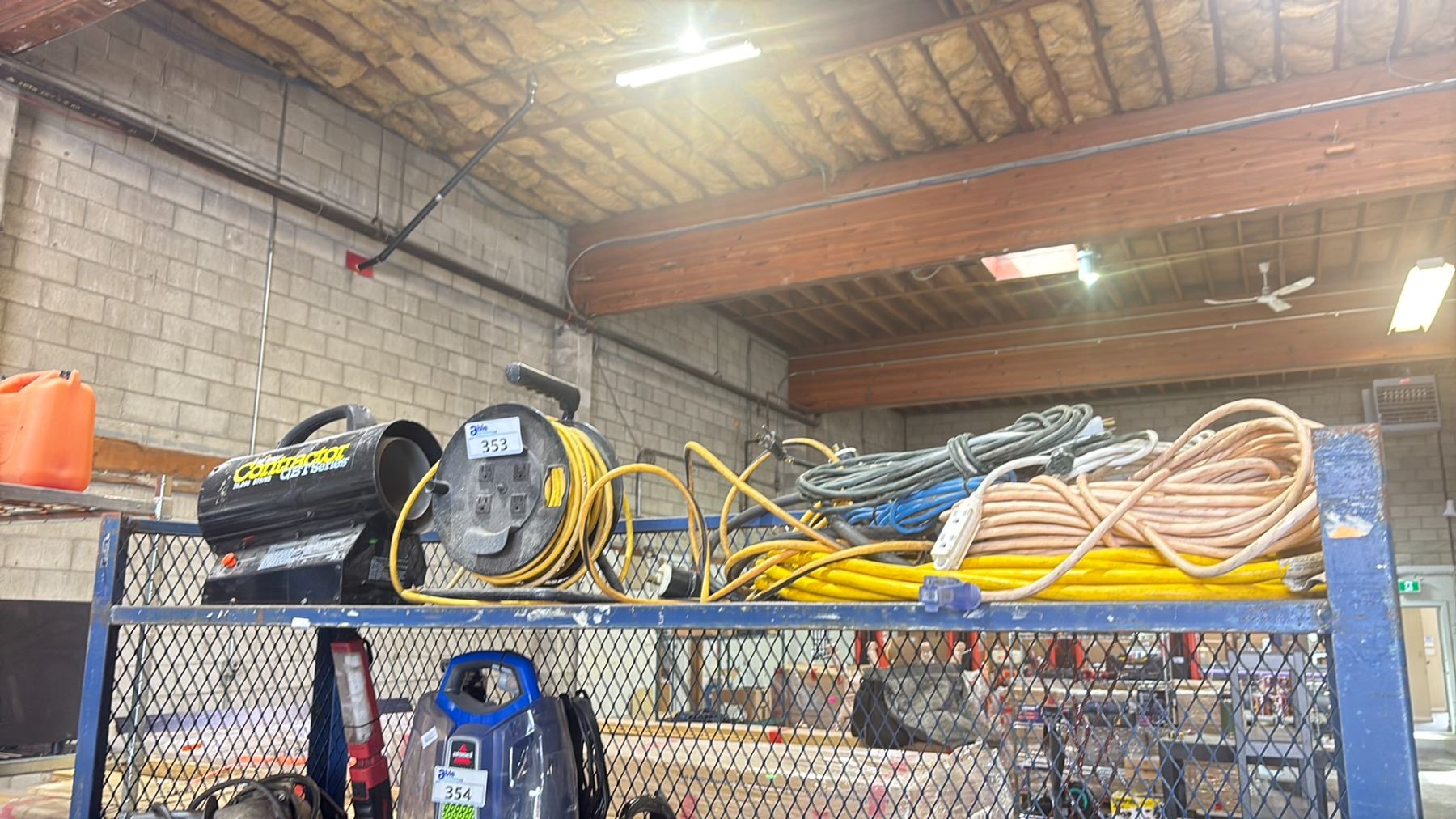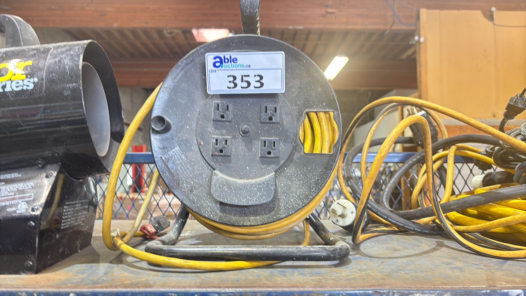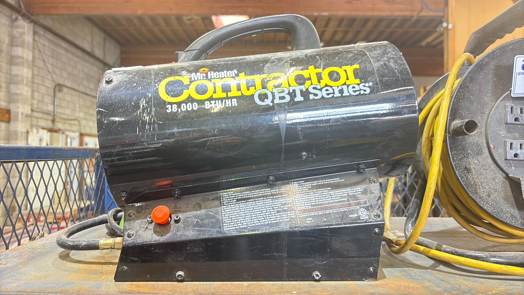 MR HEATER CONTRACTOR QBT SERIES 38,000 BTU PORTABLE PROPANE HEATER, EXTENSION CORD REEL WITH EXTENSION CORD AND OUTLETS & ASSORTED LENGTH/SIZE EXTENSION CORDS