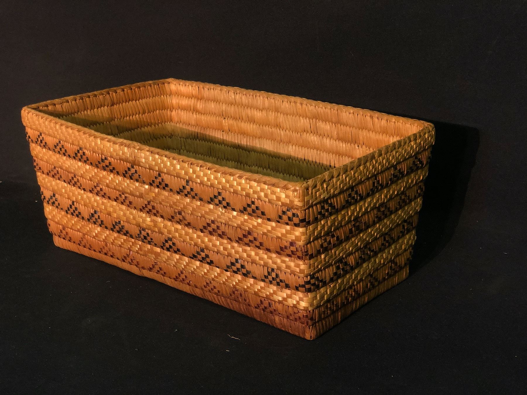 MT. CURRIE NATIVE RECTANGLE BASKET WITH OPEN BEADED IMBRICATION, 14.5" LONG X 8.5" TALL X 6" TALL