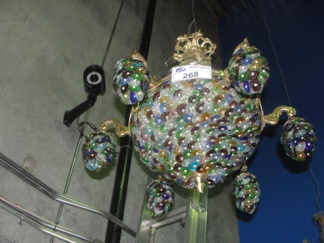 MULTI COLORED ART GLASS AND BRASS HANGING CHANDELIER