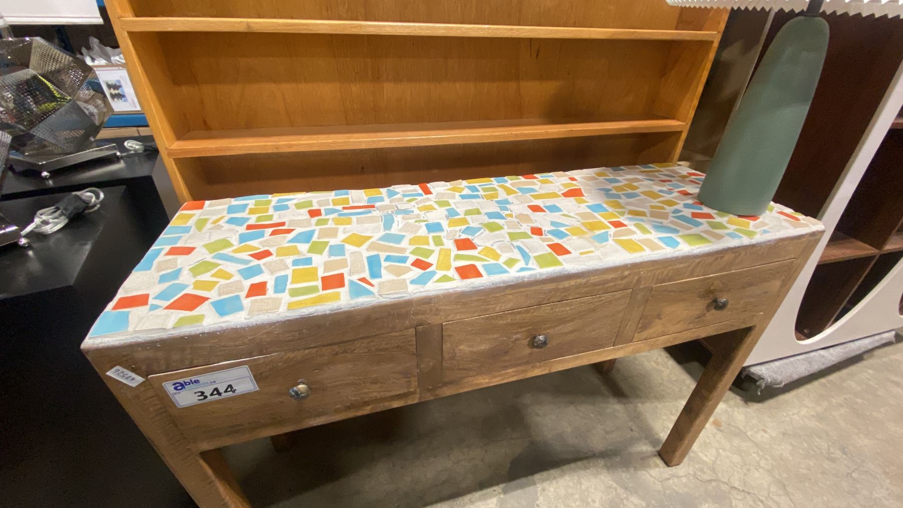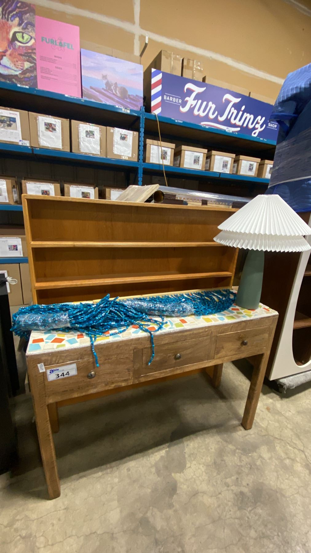 MULTI-COLOURED TILE TOP 3 DRAWER NATURAL WOOD HALLWAY TABLE WITH BEADED CURTAIN, LAMP & NATURAL WOOD STORAGE SHELF