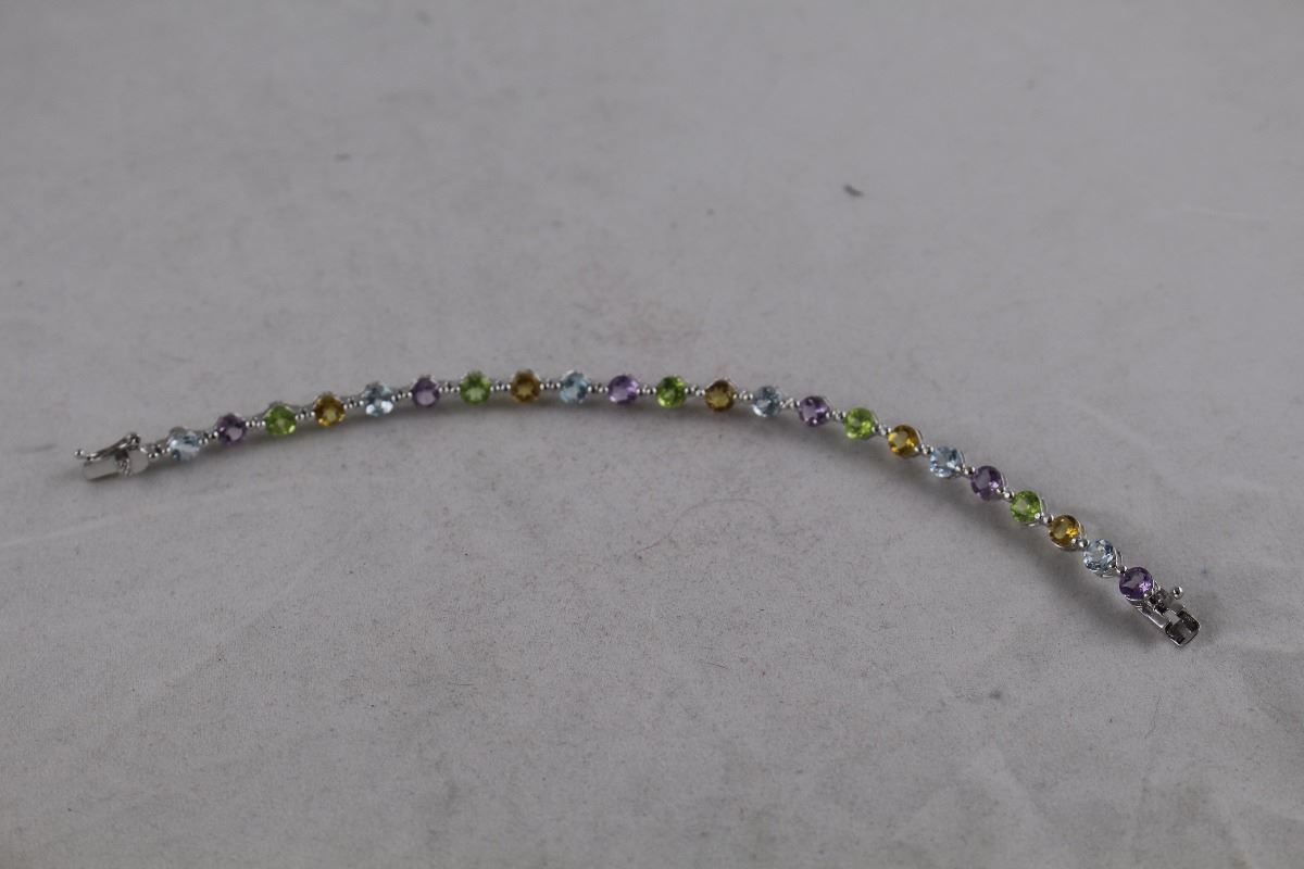 MULTI GEMSTONE TENNIS BRACELET, STERLING SILVER, 22 ROUND GEMSTONES, RETAIL VALUE $400