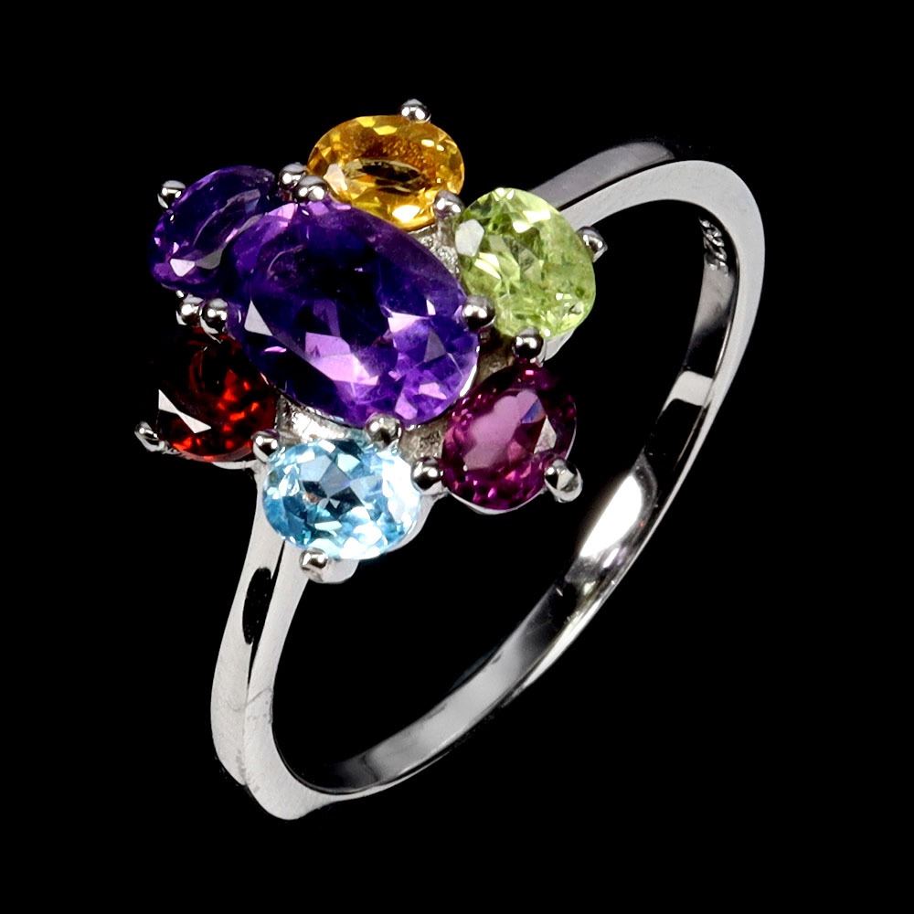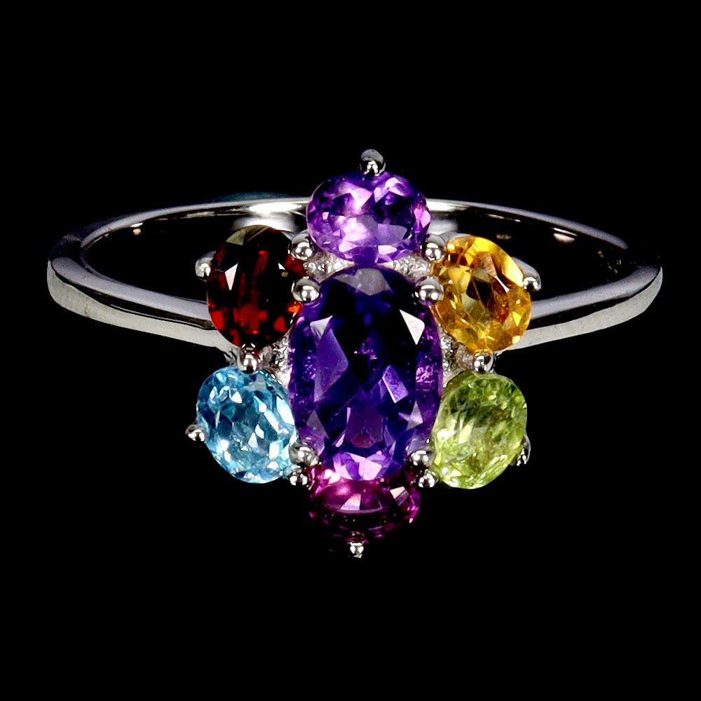 MULTIPLE GEMSTONE RING IN 14K WHITE GOLD-PLATED 925 STERLING SILVER (SIZE 7) CITRINE, MOZAMBIQUE GARNET, PERIDOT, RHODOLITE GARNET, SKY BLUE TOPAZ WITH CENTRAL AMETHYST APPRAISED REPLACEMENT VALUE CAD 350 – DIGITAL CERTIFICATE