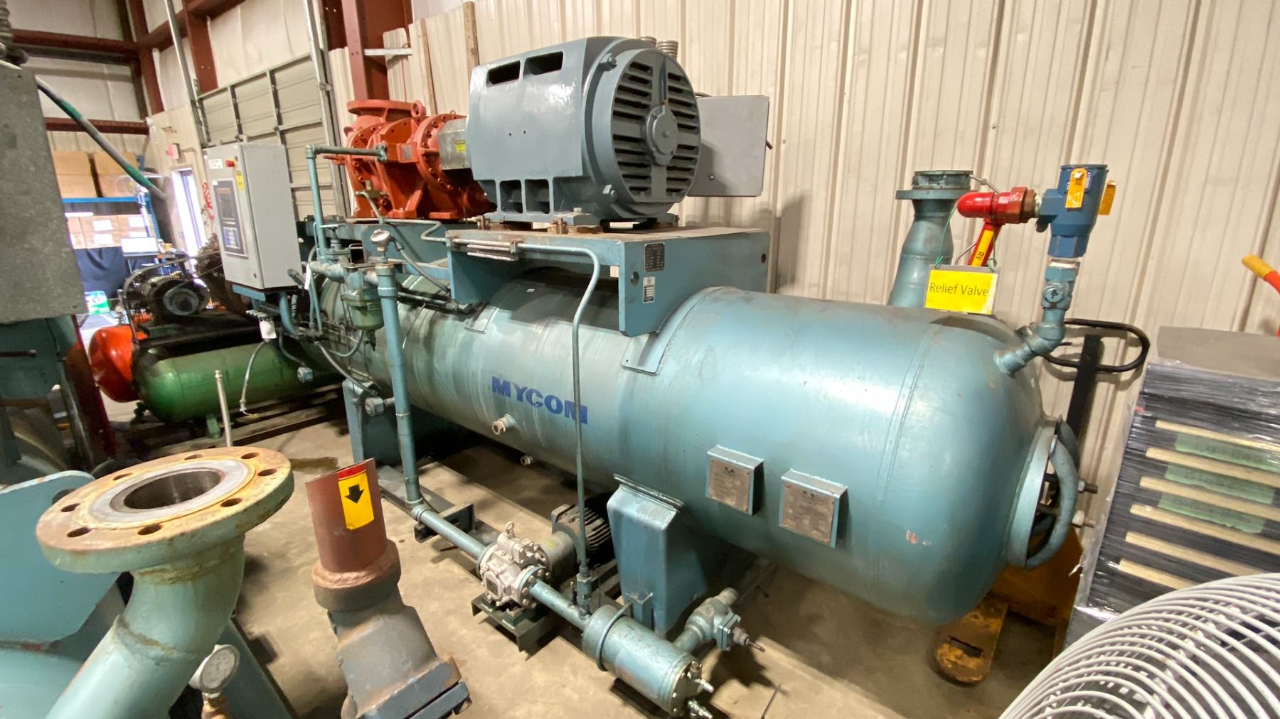 MYCOM COMPRESSOR MODEL 250 VMD 450 HORSEPOWER 3600 RPM AMMONIA SCREW COMPRESSOR TWIN ROTOR PRESSURE OIL FEED SYSTEM COMPUTER CONTROLLED SWEPT VOLUME INCLUDES OIL COOLER AND OIL SEPARATOR HAS SIDE LOAD PORTS *LAST DAY REMOVAL ONLY**REQUIRES HIAB/CRANE & HEAVY SKATES FOR REMOVAL*
