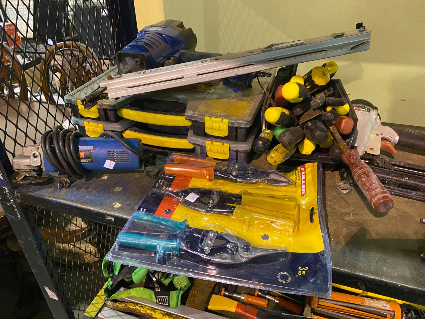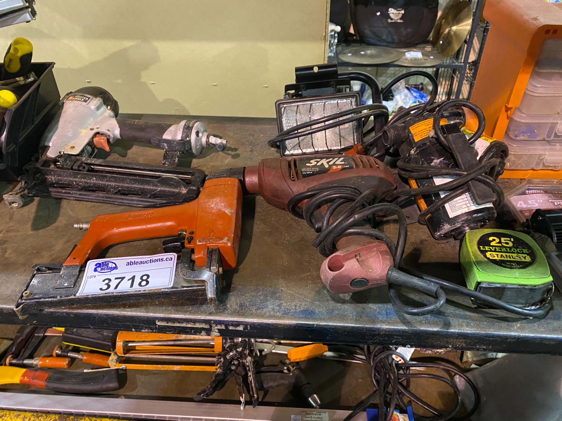 NAIL GUNS, GRINDER, ASSORTED TOOLS, & MORE