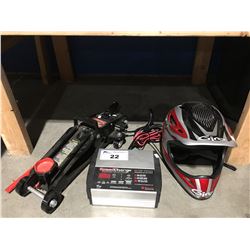 MOTOMASTER HYDRAULIC TROLLEY JACK, SPEED CHARGER & MOTOCROSS HELMET