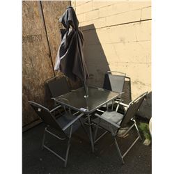 2 TONE GREY 6 PCE OUTDOOR PATIO SET - TABLE WITH UMBRELLA & 4 CHAIRS (2 CHAIRS NEED 2 BOLTS)