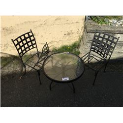 SMALL ROUND BLACK & GLASS PATIO SIDE TABLE & 2 HEAVY METAL BLACK CHAIRS (CHAIRS NEED SEATS)