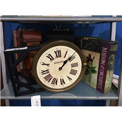 SHELF LOT OF DECORATIVE ITEMS - GRAND HOTEL PARIS CLOCK & 5 DECORATIVE BOXES