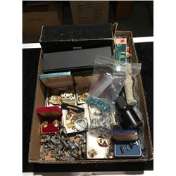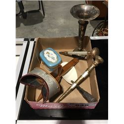 SMALL BOX OF COLLECTIBLE ITEMS - STERLING SILVER VASE, BIRKS FRANCE PORCELAIN TRINKET BOX, ANTIQUE VIEW VISOR ECT.