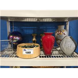 SHELF LOT OF ASSTD BEAUTIFUL VINTAGE ART GLASS & WOODEN BOWL OF MARBLES