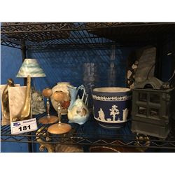 SHELF LOT OF ASSTD PORCELAIN WARES, GLASS WARES, METAL WARES & DECORATIVE PIECES181 - SHELF LOT OF ASSTD PORCELAIN WARES, GLASS WARES, METAL WARES & DECORATIVE PIECES