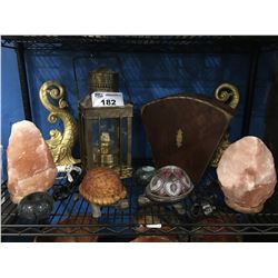 SHELF LOT OF ASSTD DECORATIVE ITEMS SALT CRYSTAL LAMPS, TURTLE LAMPS, BRASS LAMP ECT