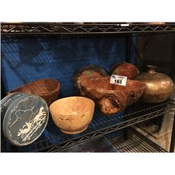 SHELF LOT OF ASSTD DECORATIVE WOODEN BOWLS, VASES & COLLECTORS TINS183 - SHELF LOT OF ASSTD DECORATIVE WOODEN BOWLS, VASES & COLLECTORS TINS