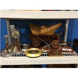 SHELF LOT OF VINTAGE DECORATIVE ITEMS WAGON LAMP, ANNIVERSARY CLOCK, BARLEY TWIST CANDLE HOLDERS ECT.