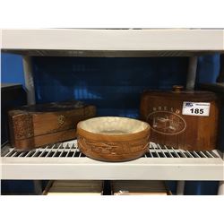 ANTIQUE WOODEN BREAD BOX, WOODEN JEWELRY BOX & LINED HAWAIIAN BOWL185 - ANTIQUE WOODEN BREAD BOX, WOODEN JEWELRY BOX & LINED HAWAIIAN BOWL