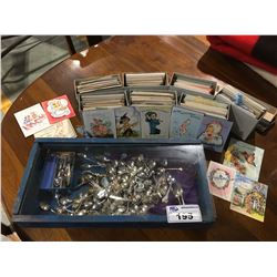 LARGE GROUP OF COLLECTORS SPOONS & BOX OF VINTAGE GREETING CARDS