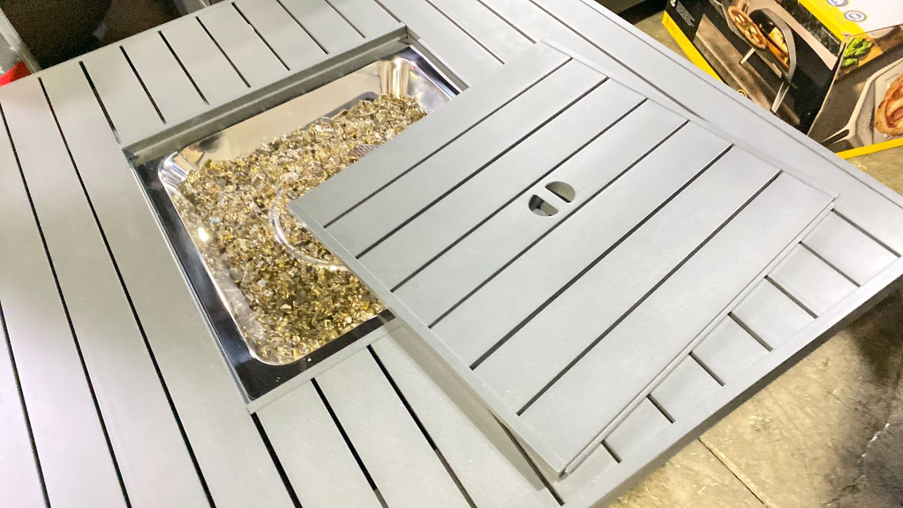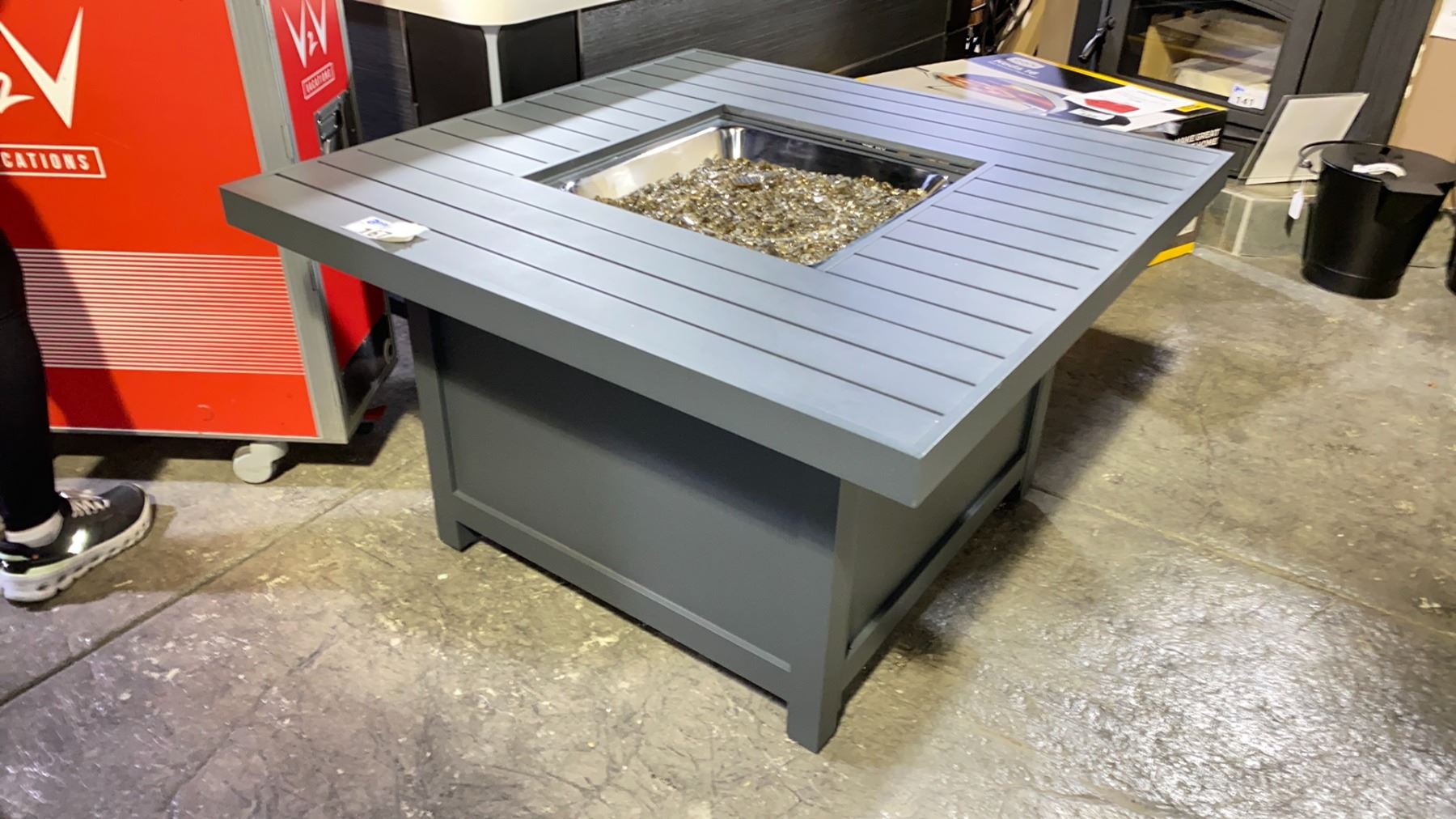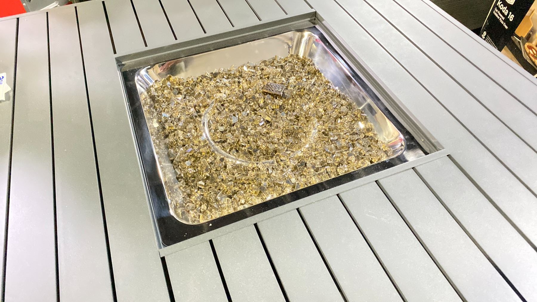 NAPOLEAN HAMPTONS SQUARE PATIOFLAME PROPANE FIRE TABLE. COMES WITH COVER AND NAT GAS CONVERSION KIT. BROWN/GOLD SPARKLE GLASS