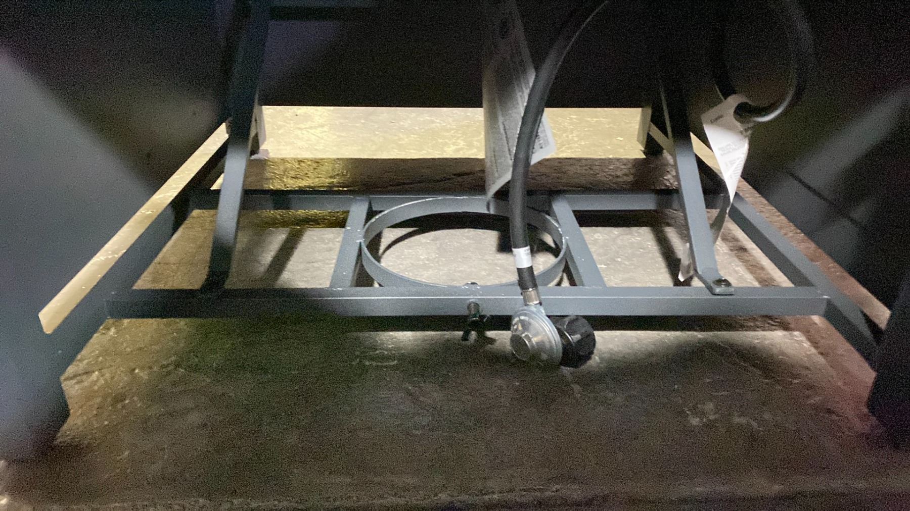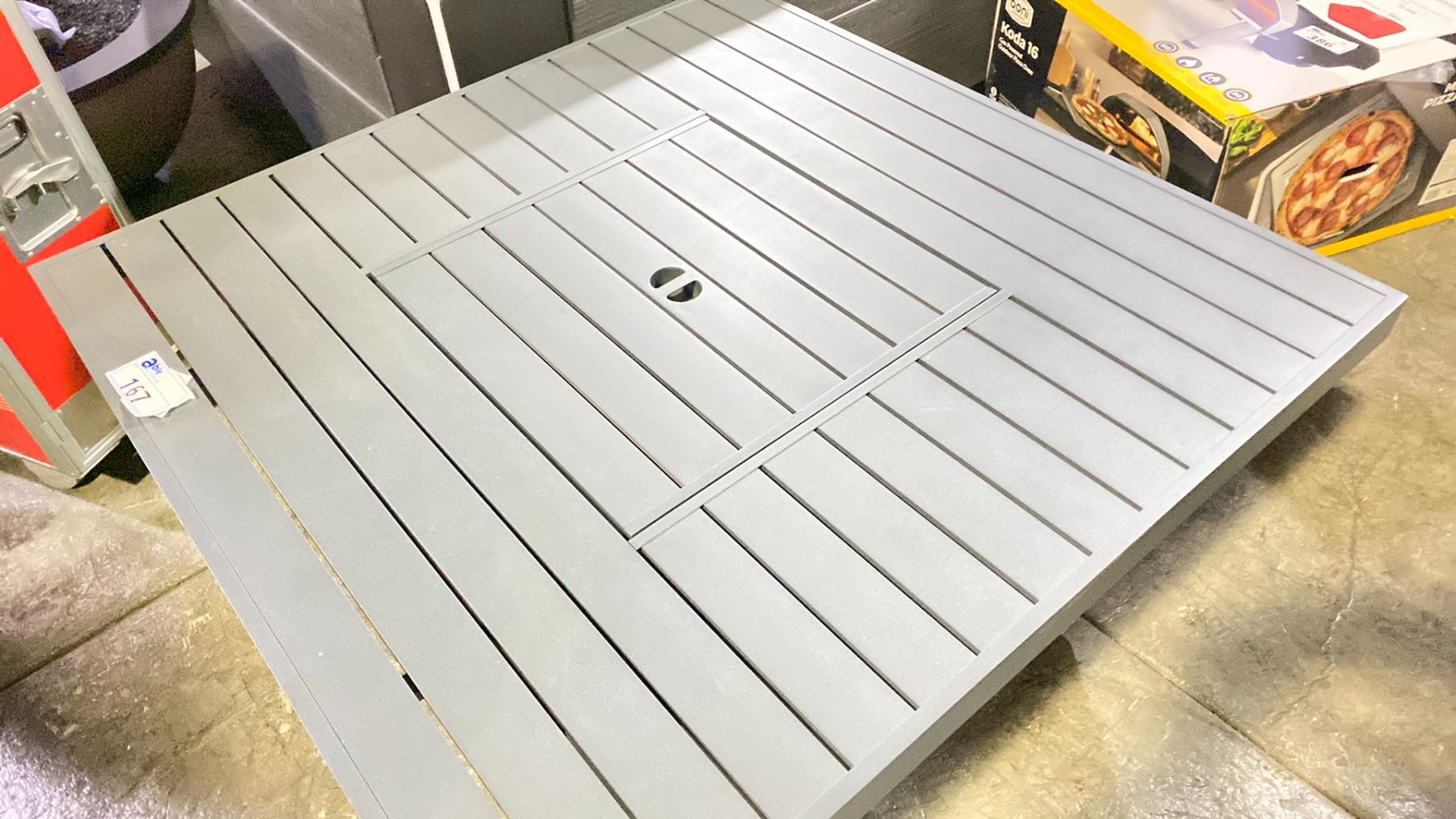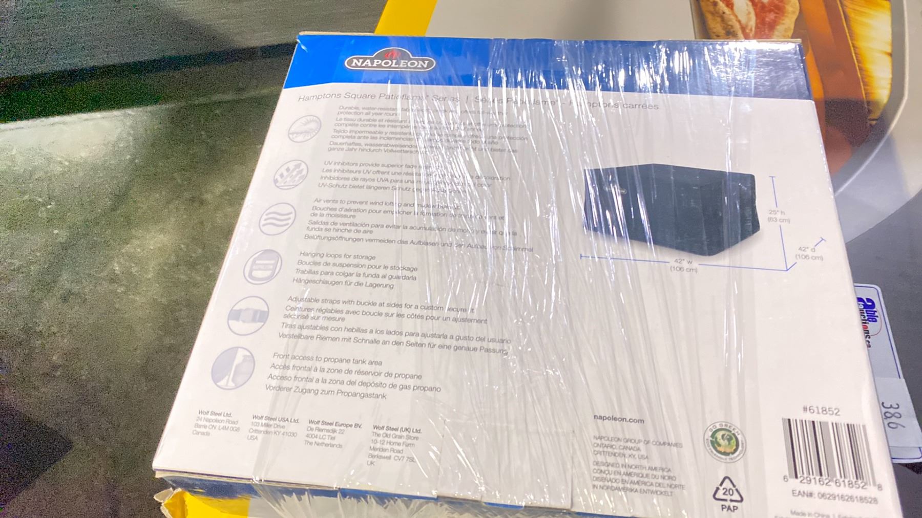 NAPOLEAN HAMPTONS SQUARE PATIOFLAME PROPANE FIRE TABLE. COMES WITH COVER AND NAT GAS CONVERSION KIT. BROWN/GOLD SPARKLE GLASS