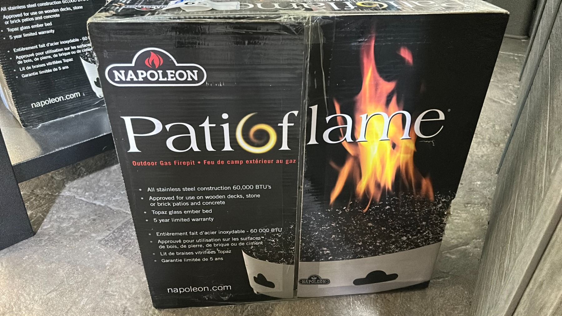 NAPOLEON PATIOFLAME OUTDOOR GAS FIREPIT. ALL STAINLESS STEEL CONSTRUCTION 60,000 BTU'S. APPROVED FOR USE ON WOODEN DECKS, STONE OR BRICK PATIOS AND CONCRETE, TOPAZ GLASS EMBER BED. PROPANE