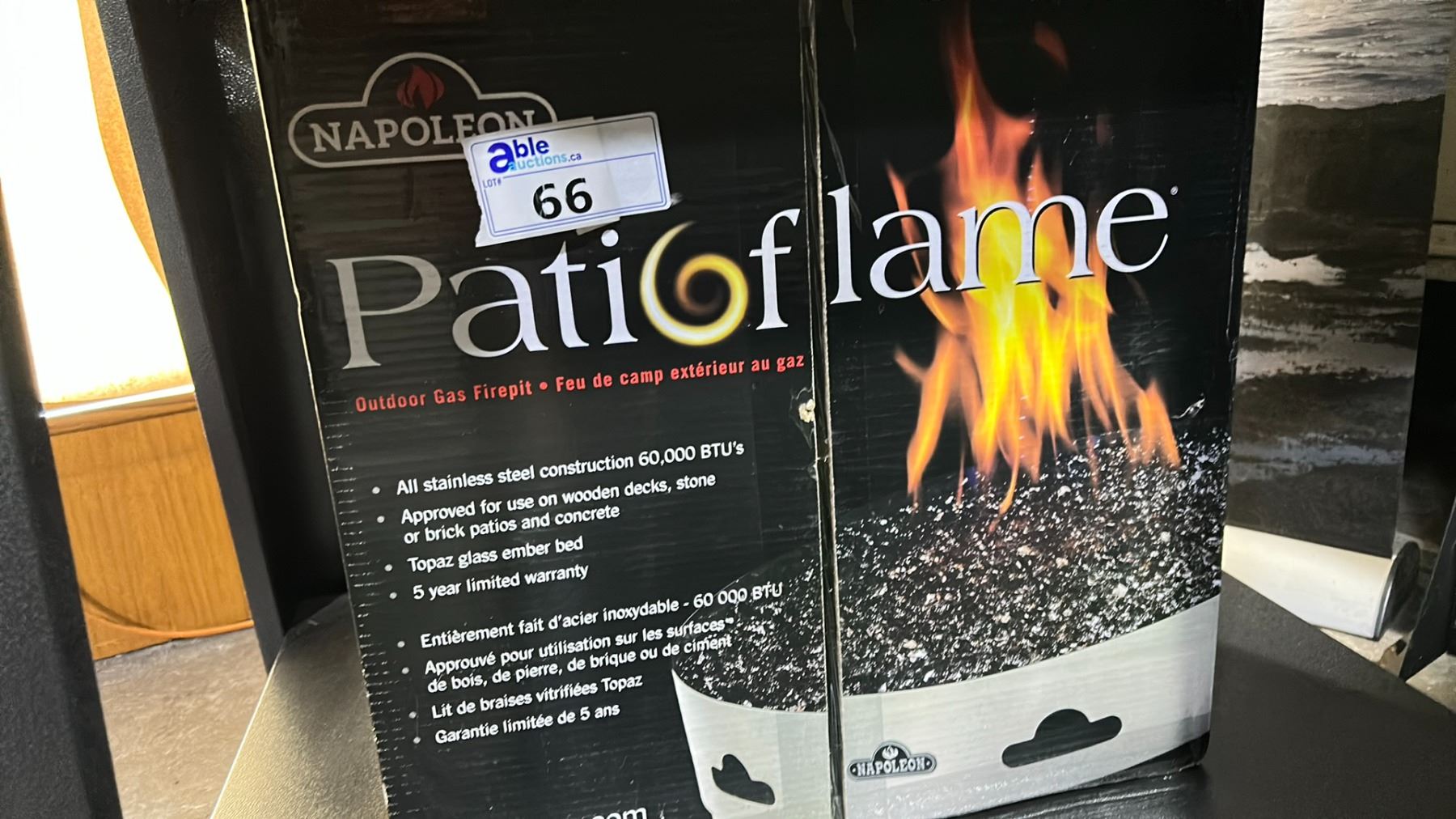 NAPOLEON PATIOFLAME OUTDOOR GAS FIREPIT. ALL STAINLESS STEEL CONSTRUCTION 60,000 BTU'S. APPROVED FOR USE ON WOODEN DECKS, STONE OR BRICK PATIOS AND CONCRETE, TOPAZ GLASS EMBER BED. PROPANE