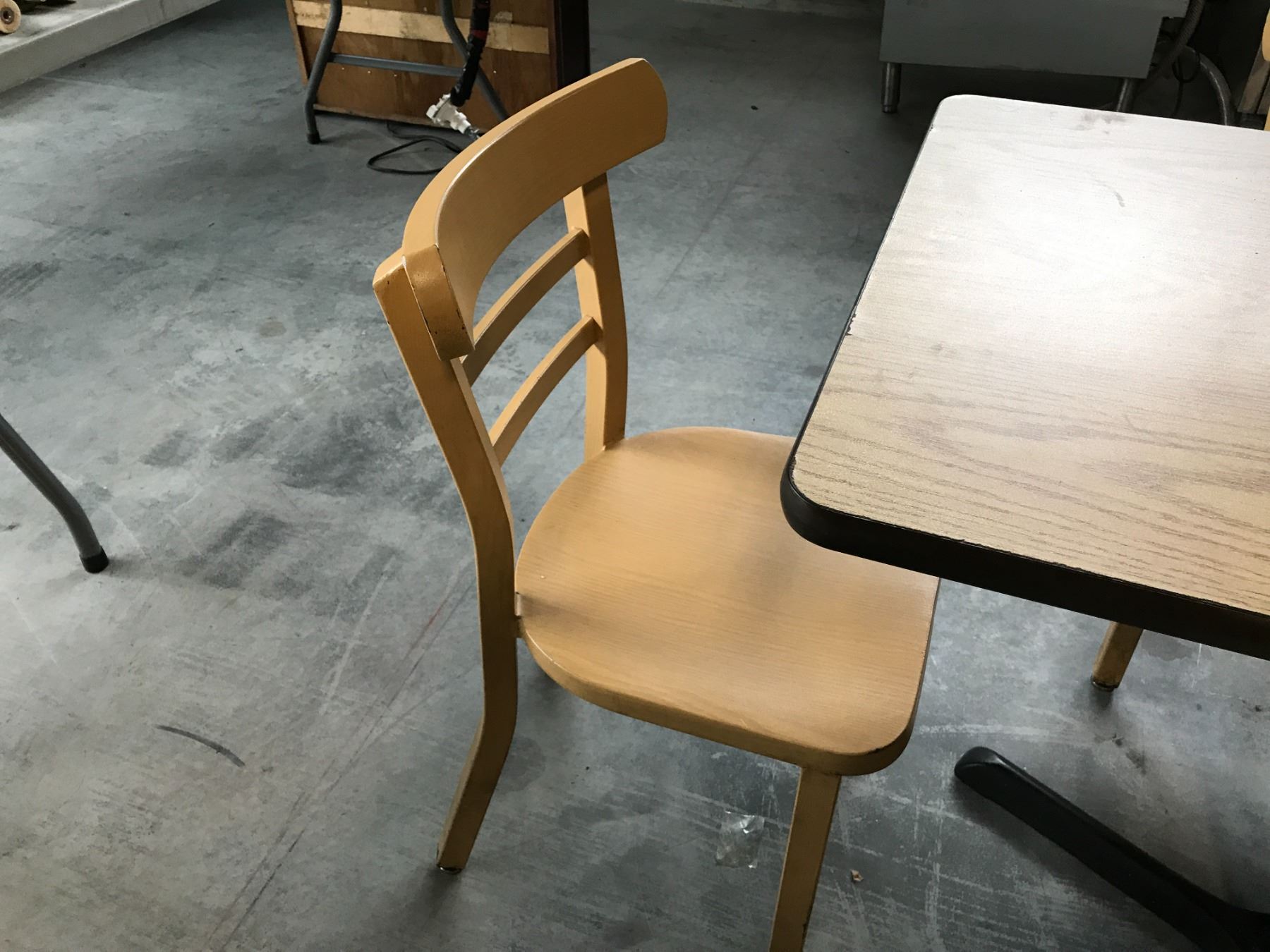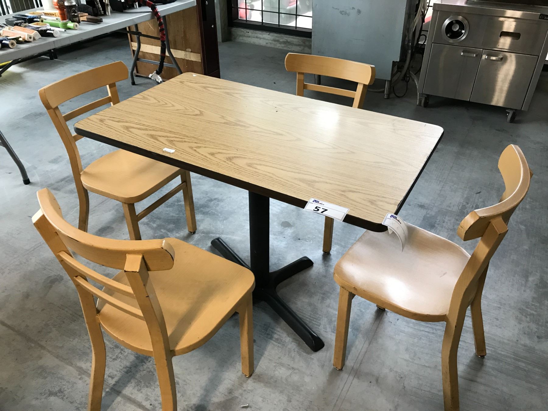 NATURAL OAK 3.5' X 2' BISTRO TABLE WITH 4 LIGHT WOOD GRAIN METAL BISTRO CHAIRS