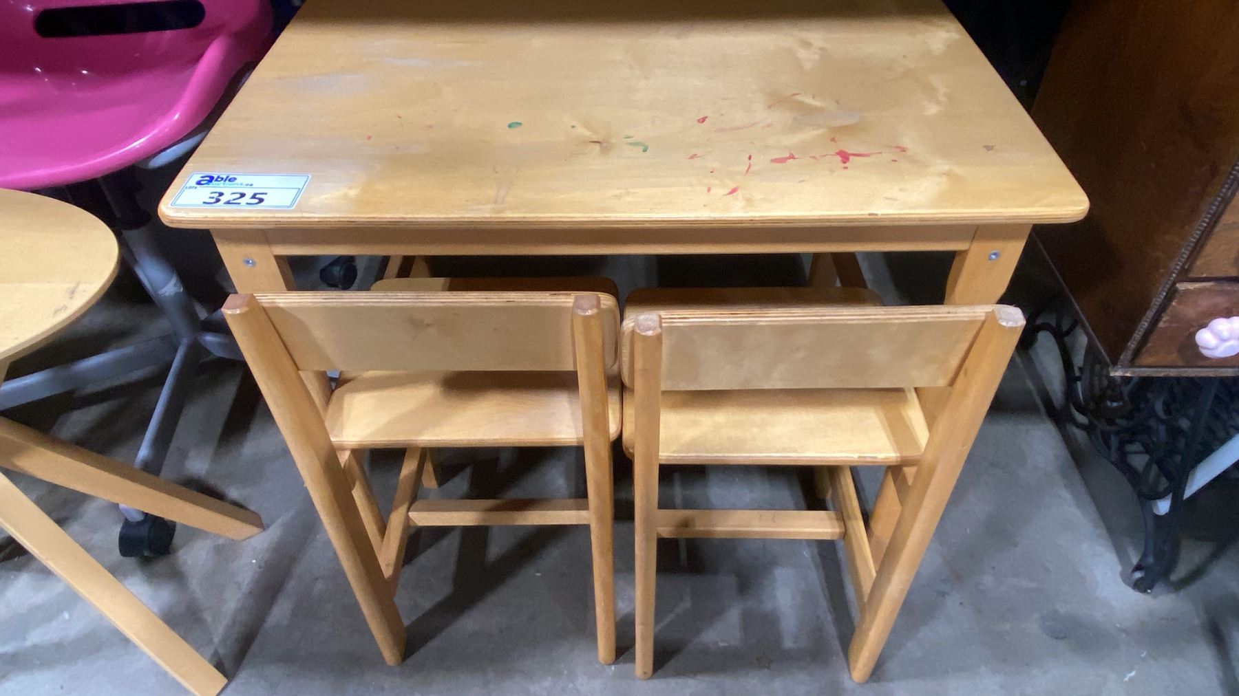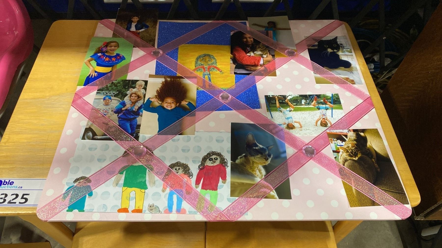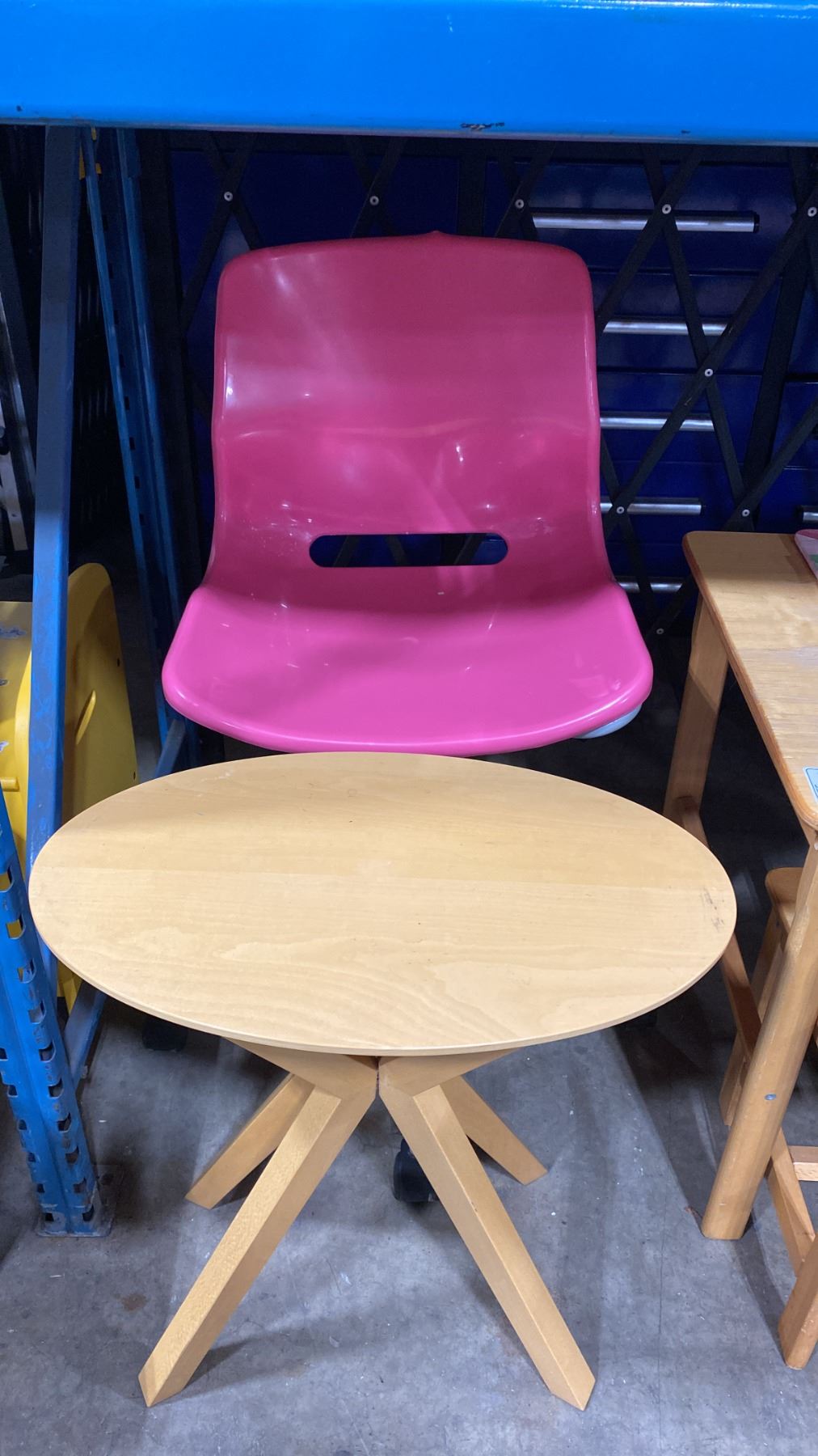 NATURAL WOOD CHILDRENS TABLE WITH 2 CHAIRS, NATURAL WOOD OVAL SIDE TABLE, PINK ROLLING CHAIR & CORKBOARD WITH ASSORTED PICTURES *PINK CHAIR NEEDS REPAIR*