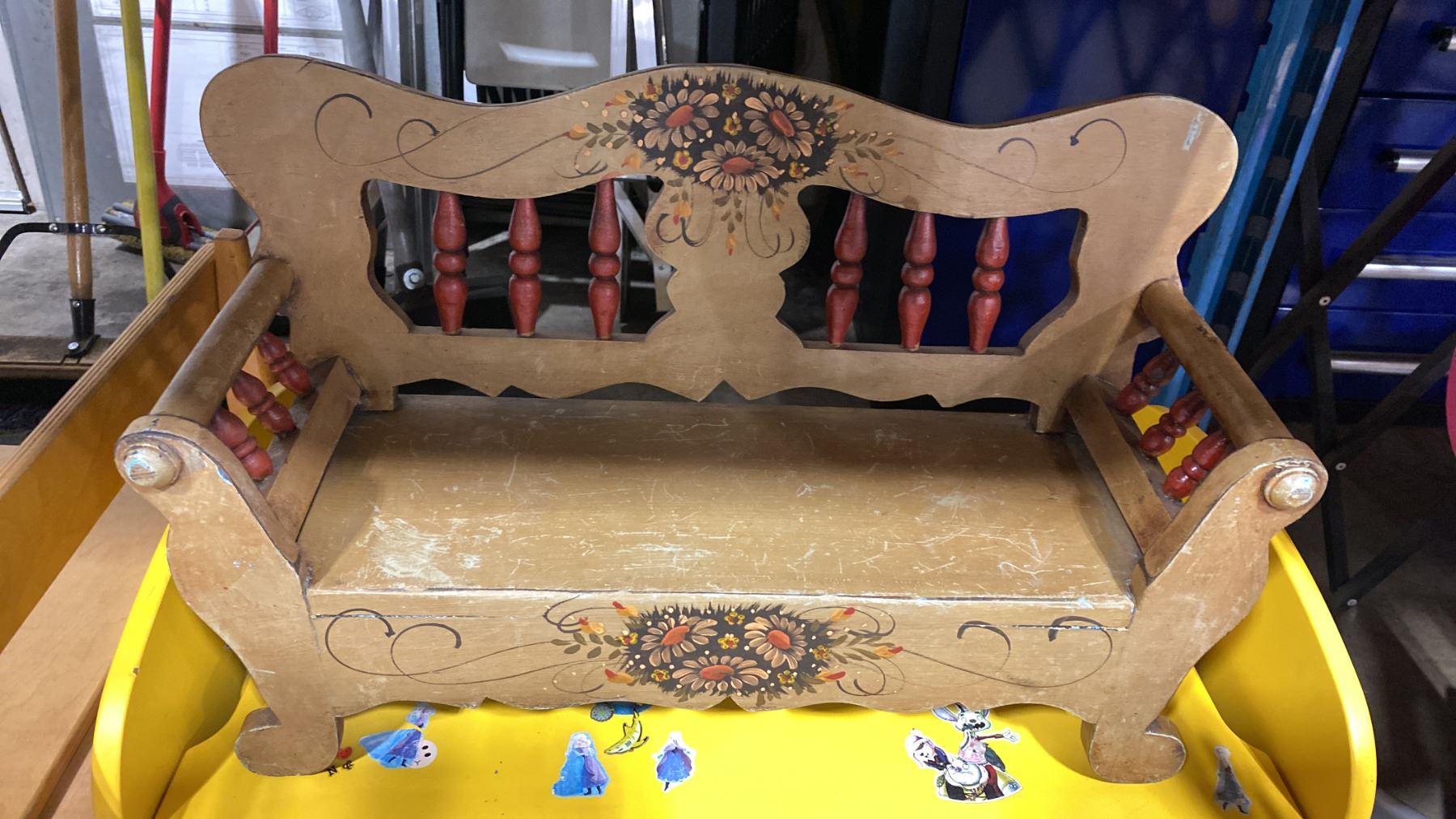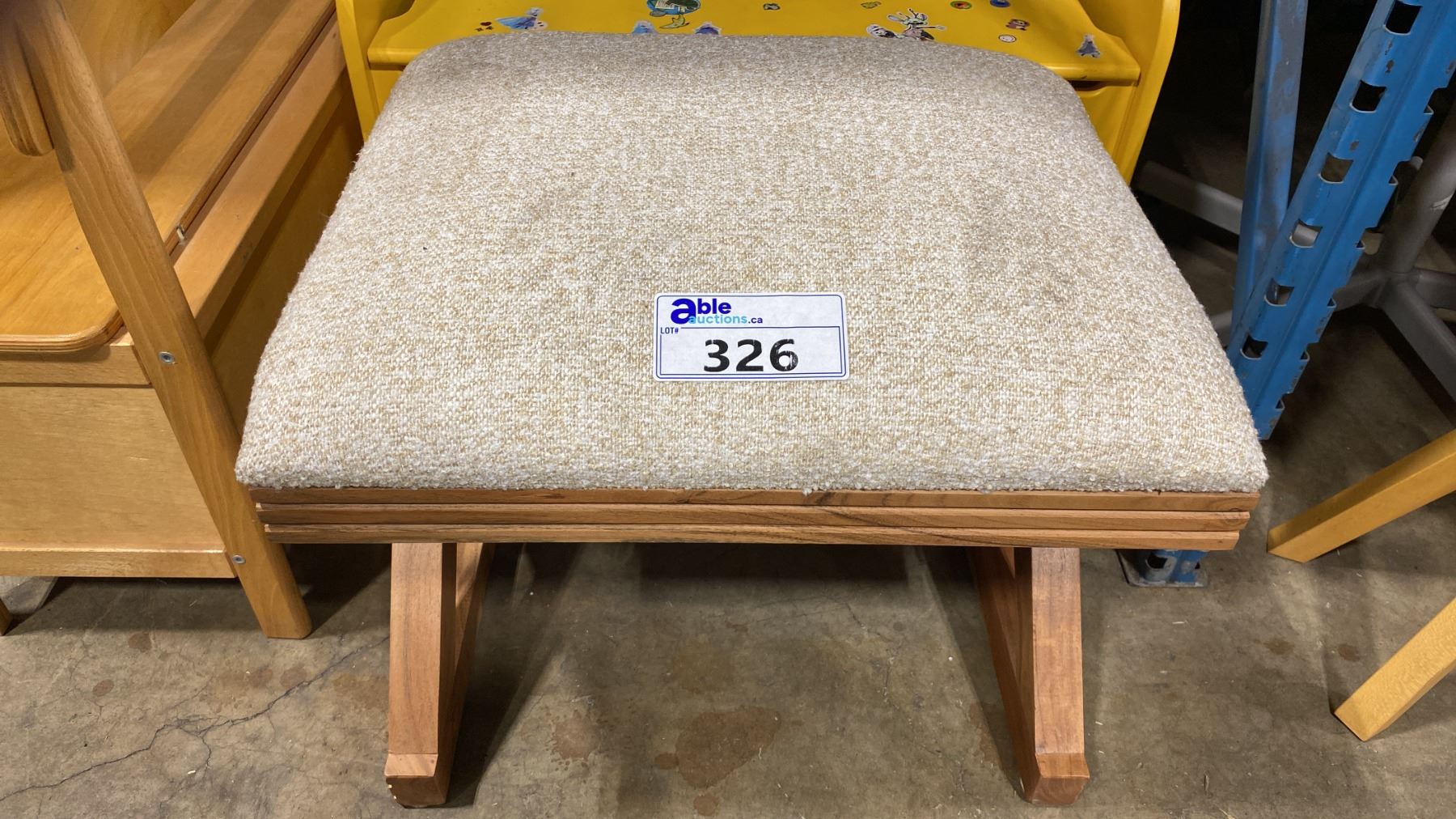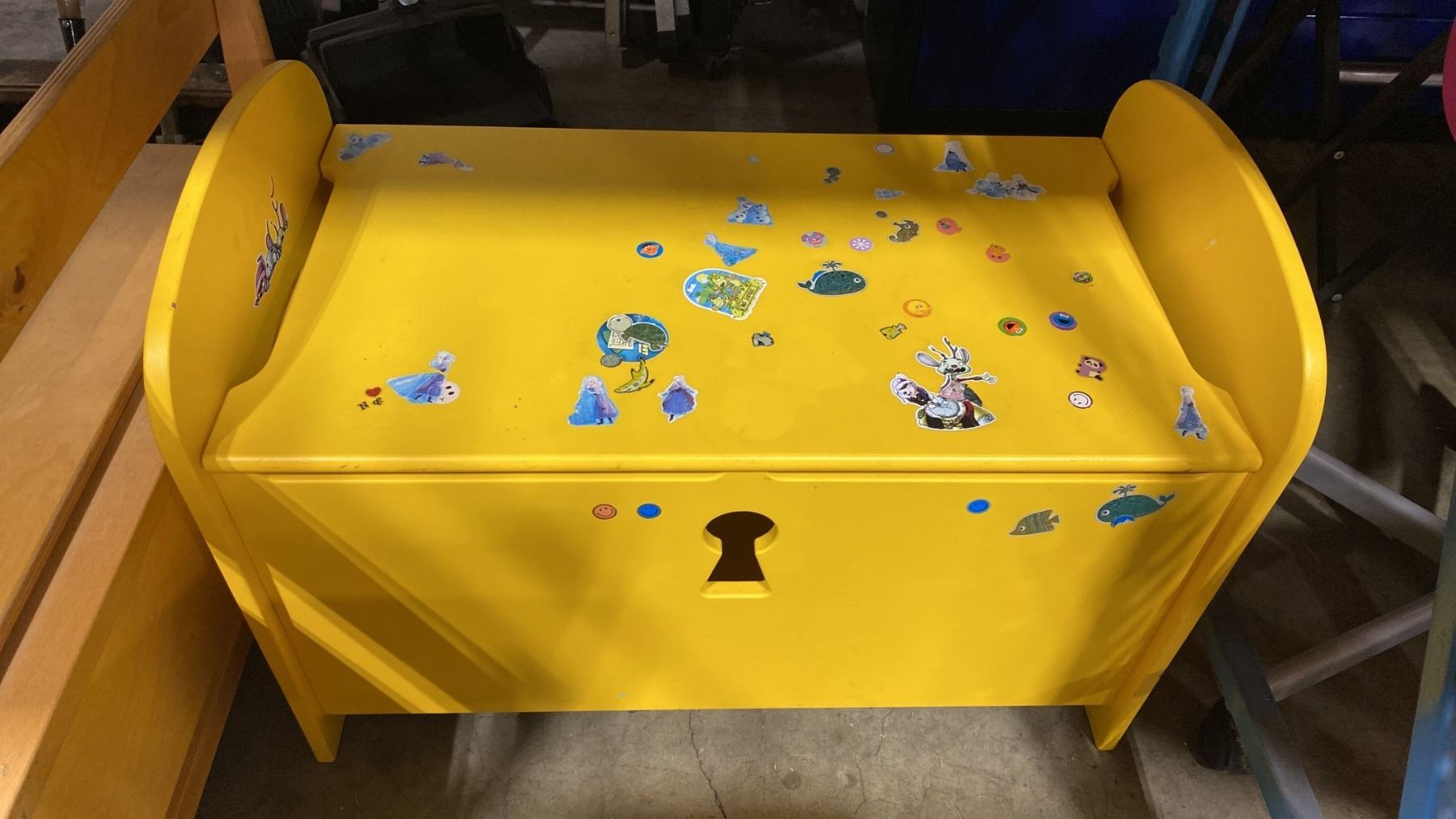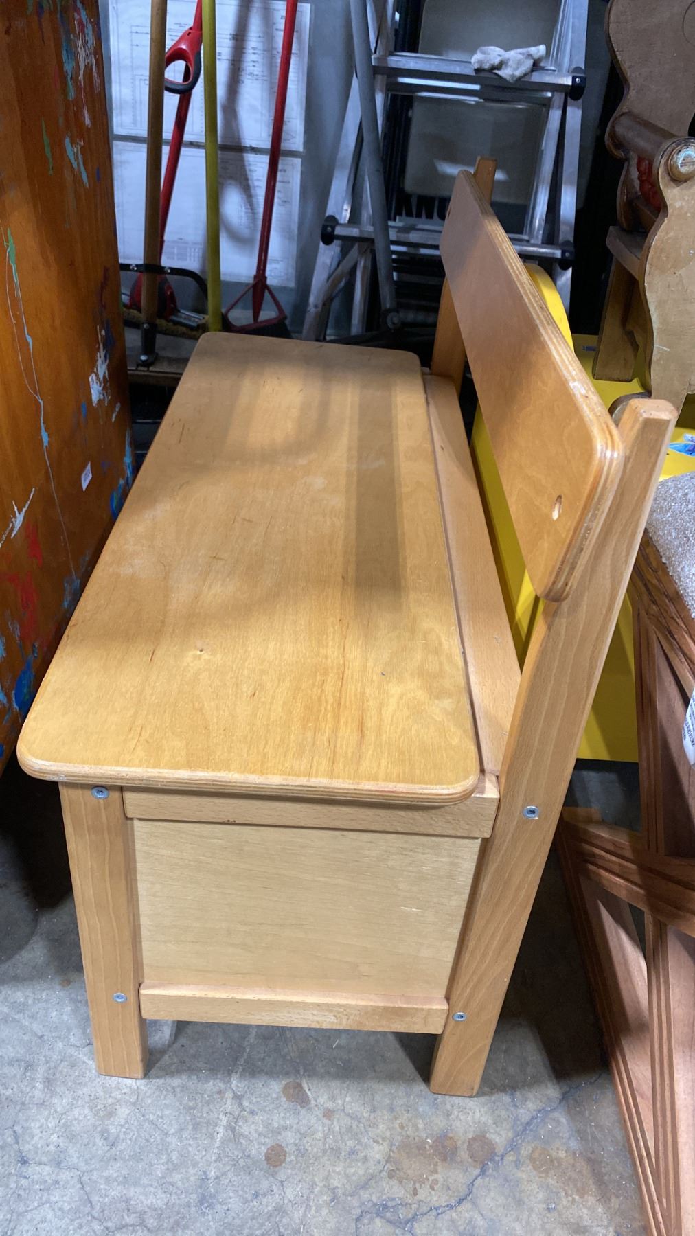 NATURAL WOOD PADDED OTTOMAN, YELLOW CHILDRENS STORAGE BENCH, NATURAL WOOD CHILDRENS STORAGE BENCH AND DOLL BENCH