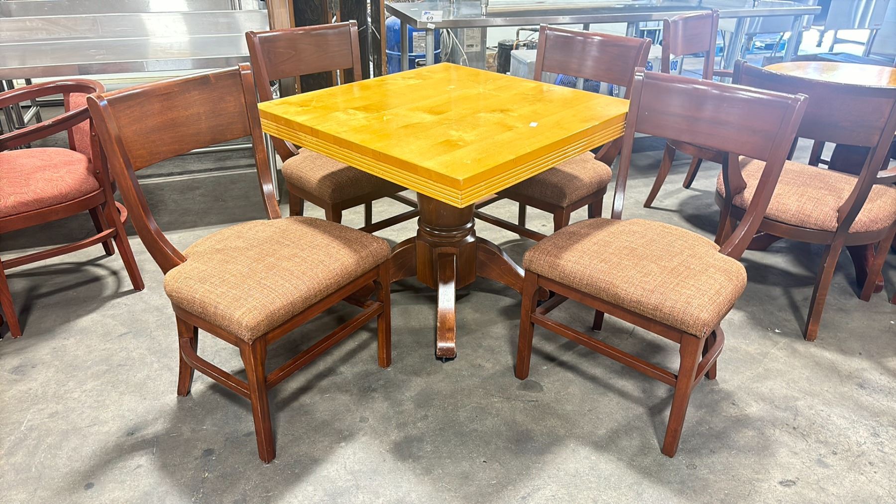NATURAL WOOD TOP 36  SQUARE DARK WOOD SINGLE PEDESTAL COMMERCIAL CAFE TABLE WITH 4 DARK WOOD PADDED