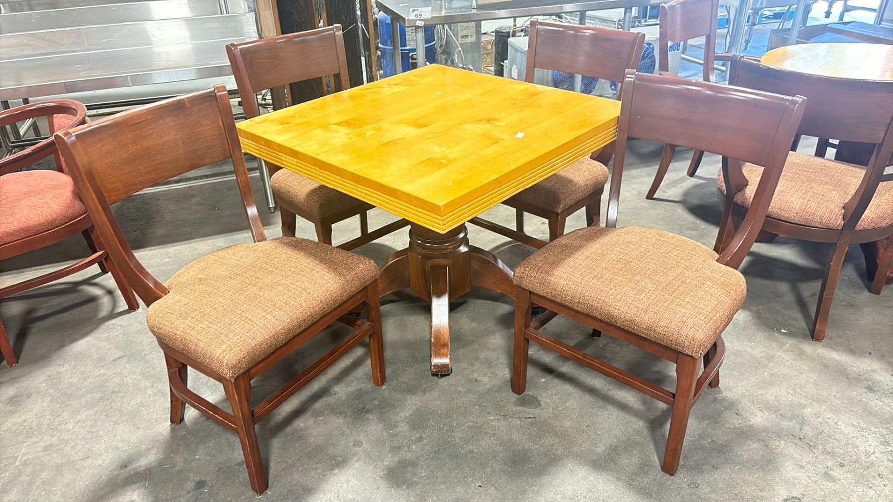 NATURAL WOOD TOP 36  SQUARE DARK WOOD SINGLE PEDESTAL COMMERCIAL CAFE TABLE WITH 4 DARK WOOD PADDED