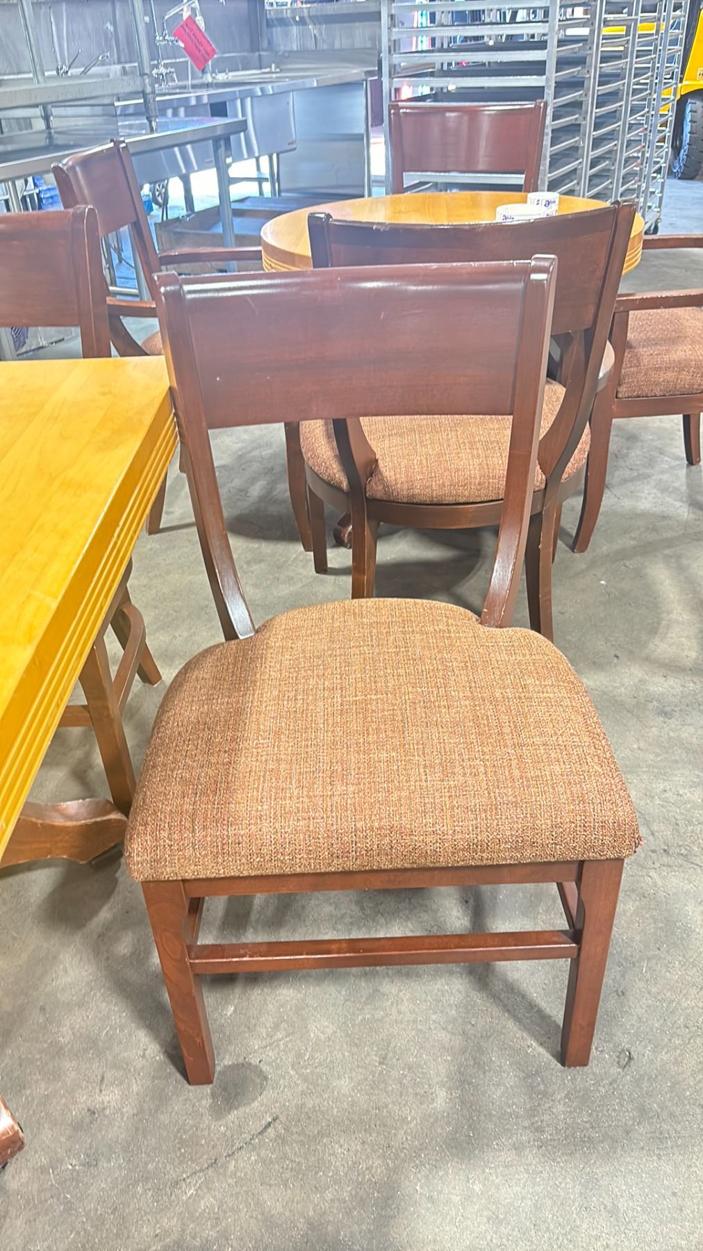 NATURAL WOOD TOP 36" SQUARE DARK WOOD SINGLE PEDESTAL COMMERCIAL CAFE TABLE WITH 4 DARK WOOD PADDED CAFE SIDE CHAIRS
