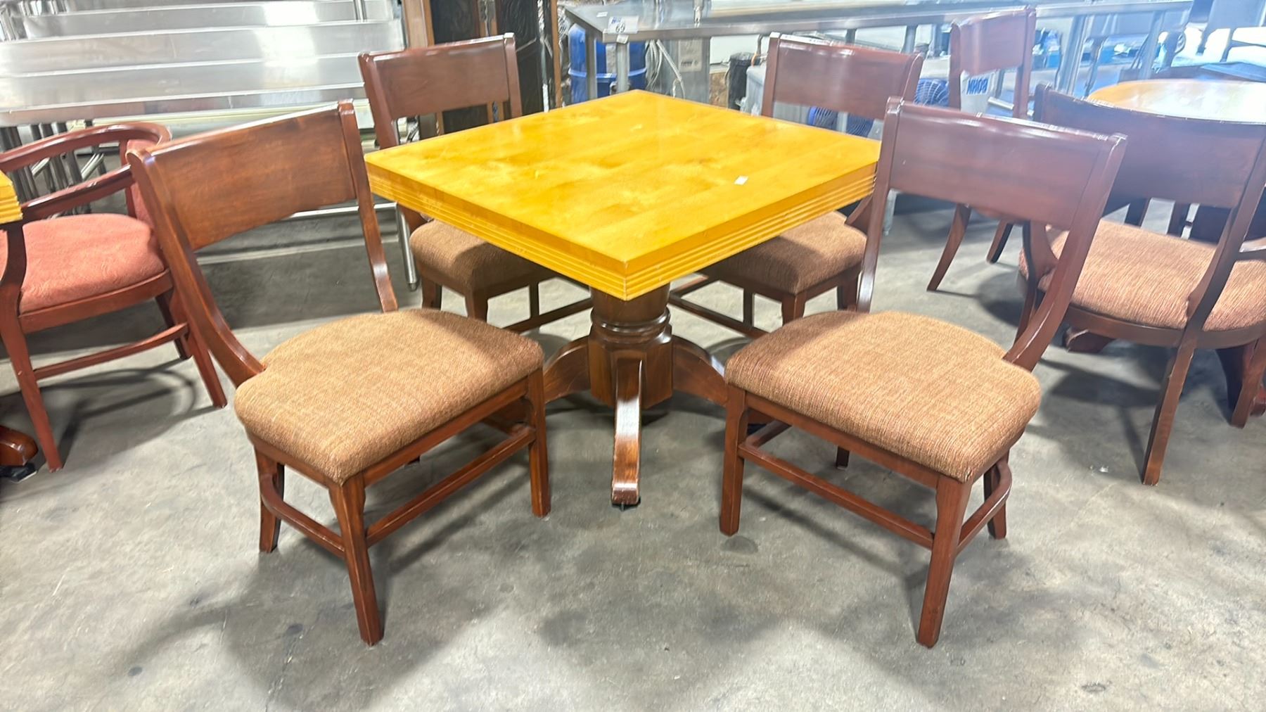 NATURAL WOOD TOP 36  SQUARE DARK WOOD SINGLE PEDESTAL COMMERCIAL CAFE TABLE WITH 4 DARK WOOD PADDED