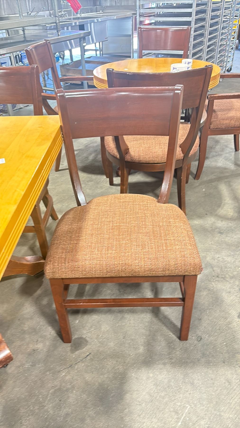 NATURAL WOOD TOP 36" SQUARE DARK WOOD SINGLE PEDESTAL COMMERCIAL CAFE TABLE WITH 4 DARK WOOD PADDED CAFE SIDE CHAIRS