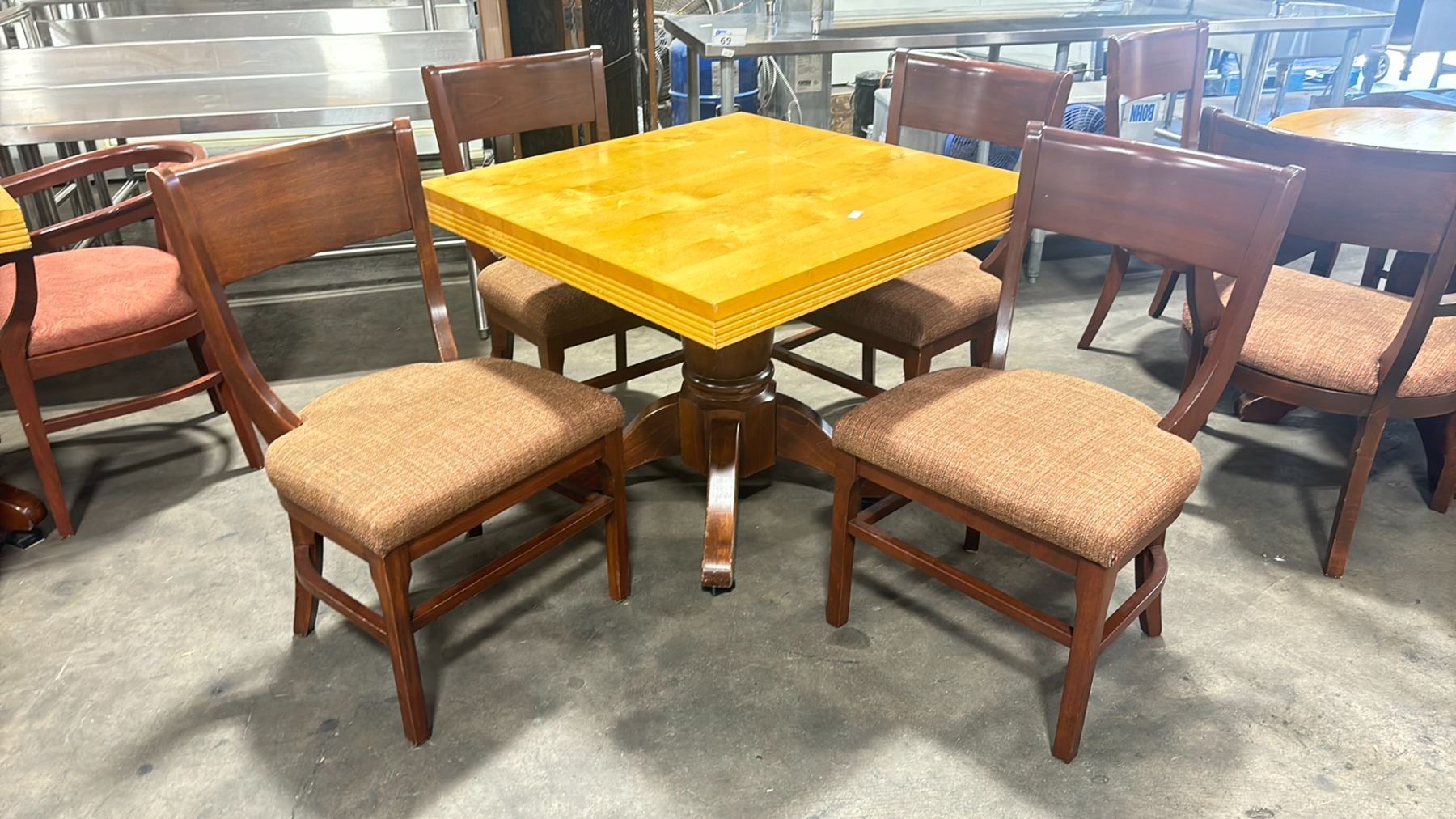 NATURAL WOOD TOP 36  SQUARE DARK WOOD SINGLE PEDESTAL COMMERCIAL CAFE TABLE WITH 4 DARK WOOD PADDED